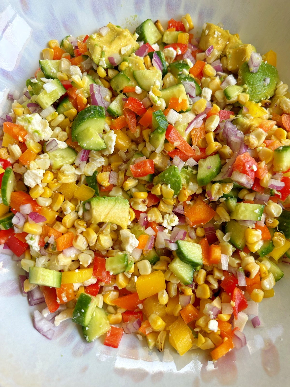 Summer’s almost here. . you know because the kids are out of school and you can find sweet corn on the cob everywhere. Here’s another great, fresh salad to enjoy! This is the easiest and most yummy (most yummy?) salad out there! It’s light and refreshing. ’nuff said. Thank you to the Authentic Suburban Gourmet for her lovely recipe! I just added yellow and orange bell peppers for color and taste!