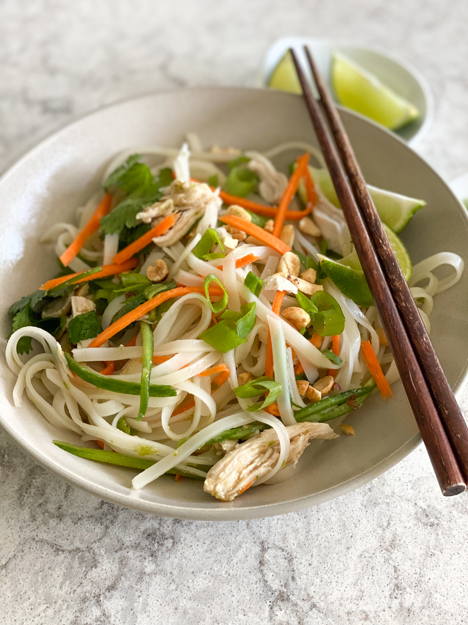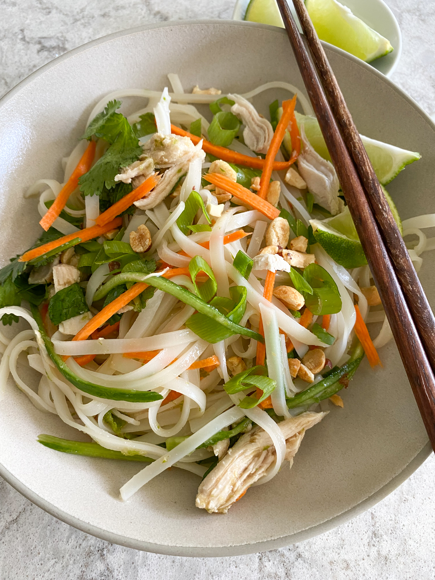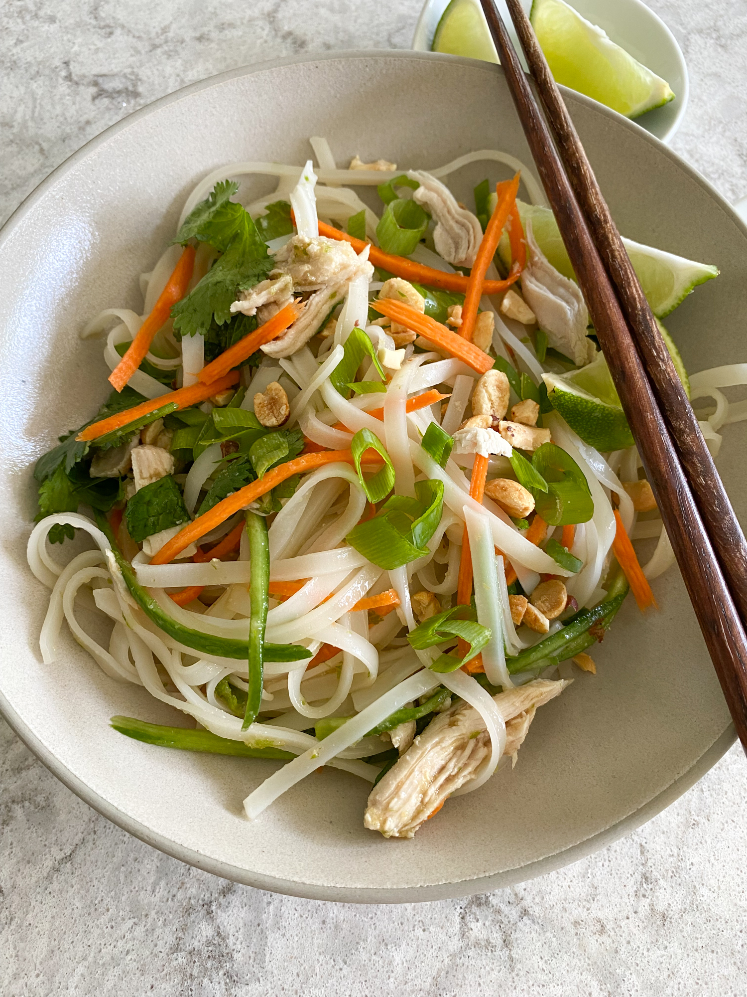 - Transfer the rice noodles to a large mixing bowl. Add the shredded chicken, carrots, cucumber, cilantro and mint and toss together. Add the dressing over the top and toss together until evenly coated. Sprinkle the rice noodles with peanuts and serve with lime wedges if desired. Enjoy!