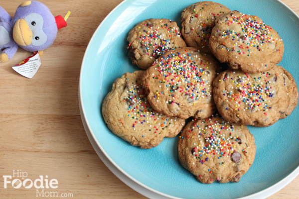 These are great because the kids can help decorate them. We just threw the sprinkles on right before we put these in the oven but you can also mix them in your cookie dough. These are also great for just plain ole sugar cookies but yesterday we wanted everything: chocolate chips, peanut butter morsels, sprinkles. . the whole shabang!