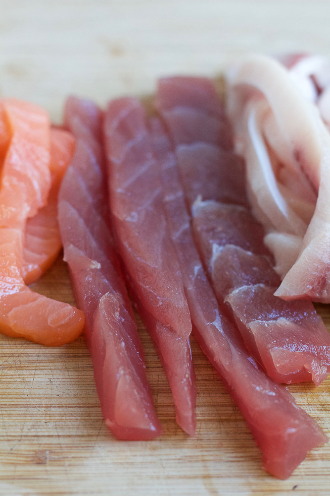 - 5 to 6 ounces sushi-grade fish tuna, salmon or yellowtail, or whatever you want to use, sliced into strips