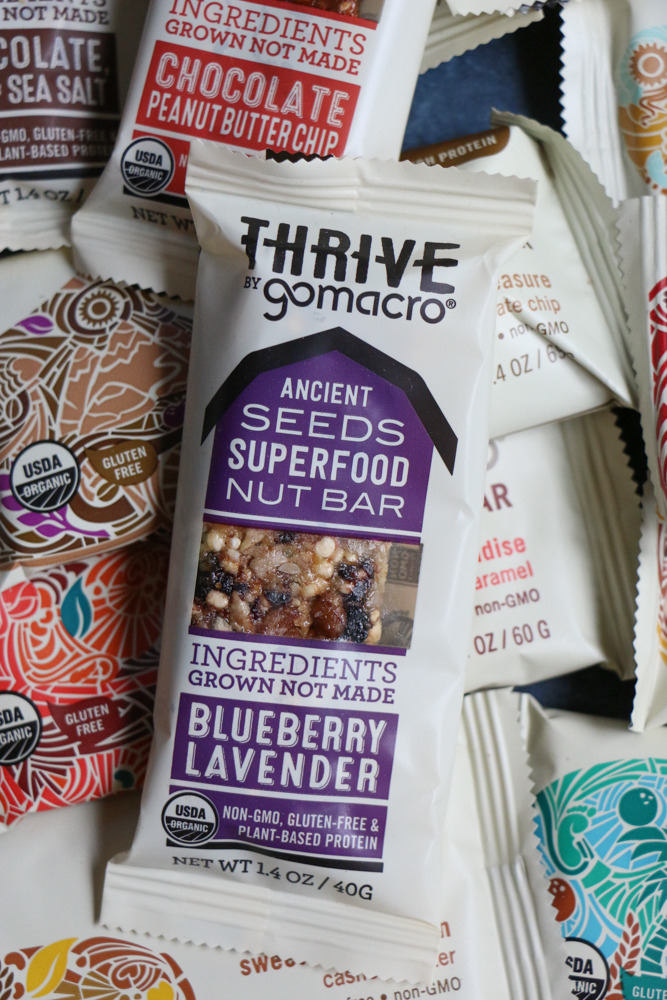 This Vegan Buddha Bowl is packed with farro, mixed greens and arugula, carrot ribbons, grilled veggies, roasted spiralized golden beets and potatoes, blackberries, raspberries and more! And I had these Thrive bars, also made by GoMacro, I’m loving the Blueberry Lavender, so I threw some cut pieces of this bar on top as well!