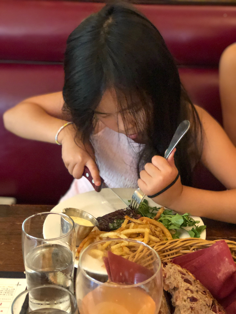 My husband ordered the Cheeseburger (grilled onion, raclette cheese, pommes frites) and my kids split the Steak Frites, seared hanger steak, maître d’ butter!!