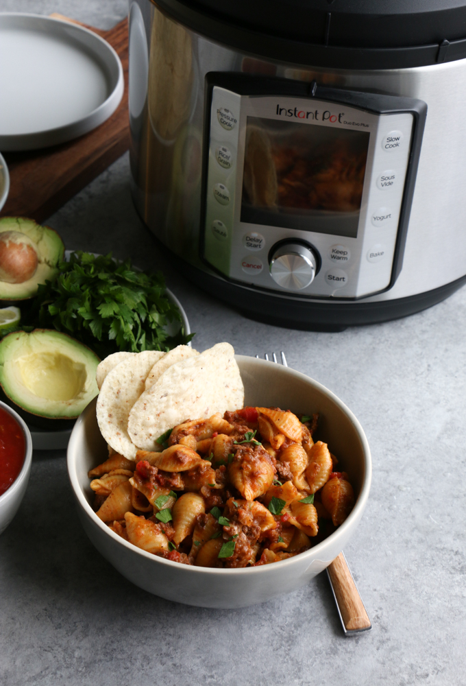So, then I thought: Instant Pot Cheesy Taco Pasta with tortilla chips! Why not?! I hope you try this recipe and if you do, let me know how you like it!