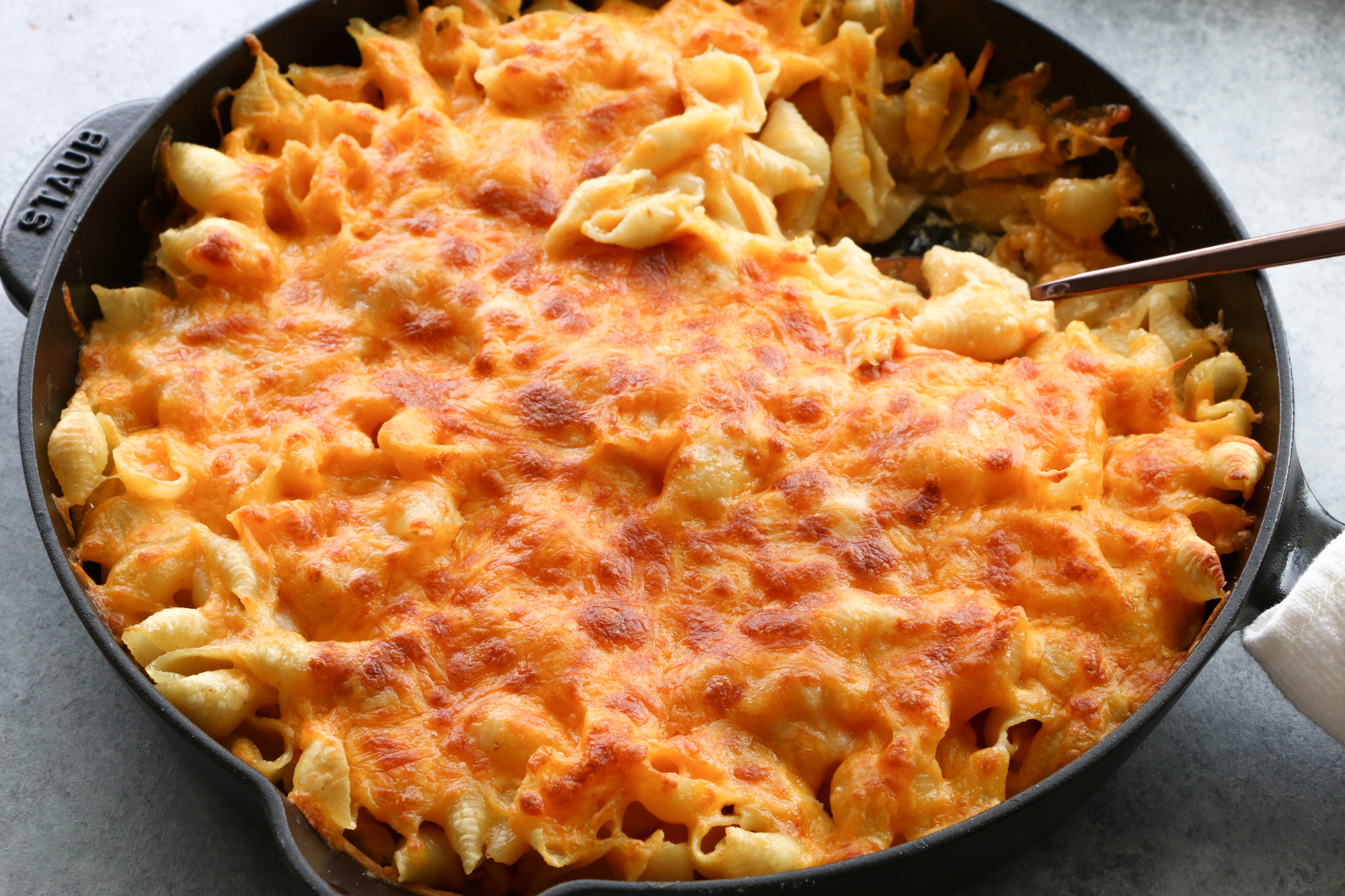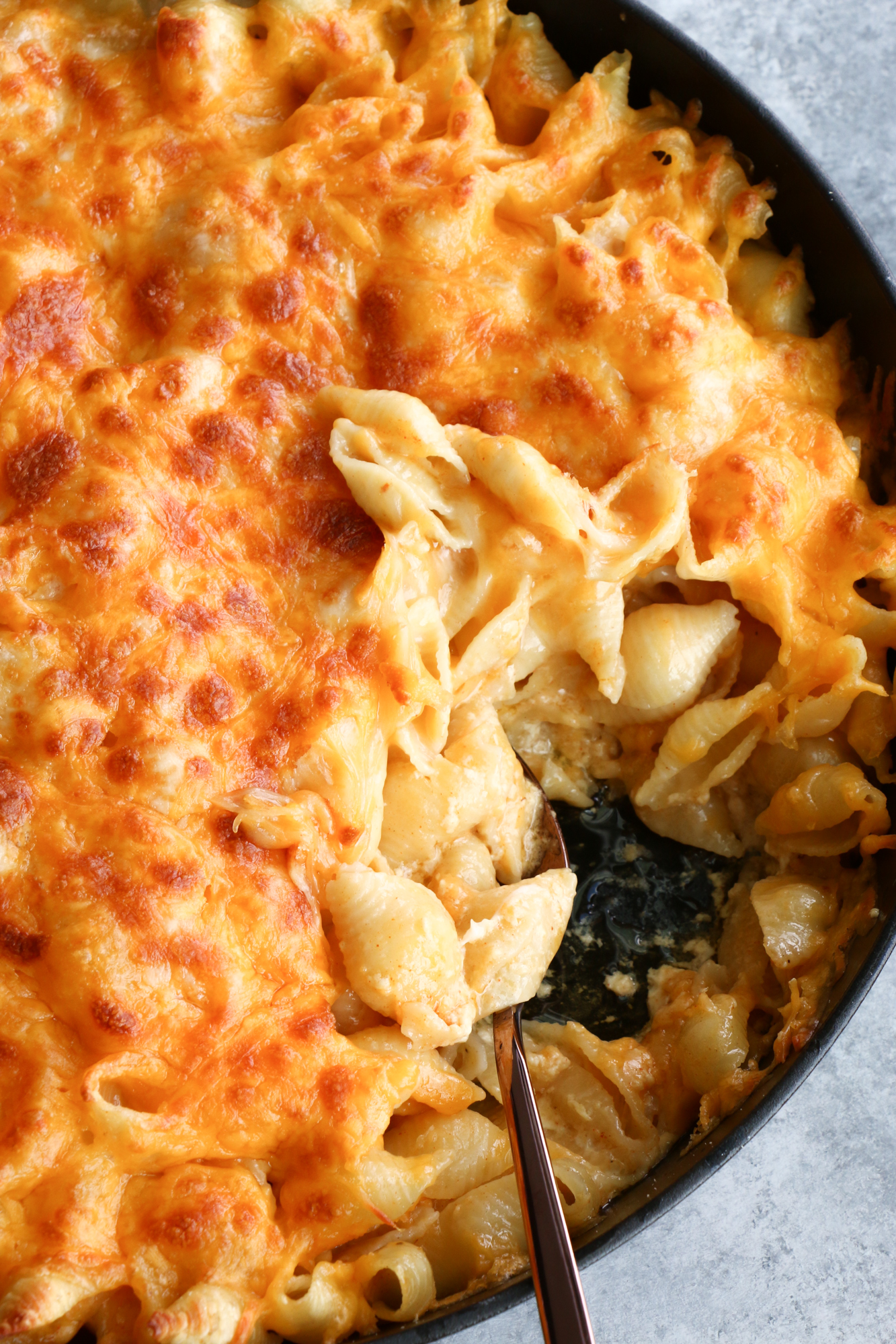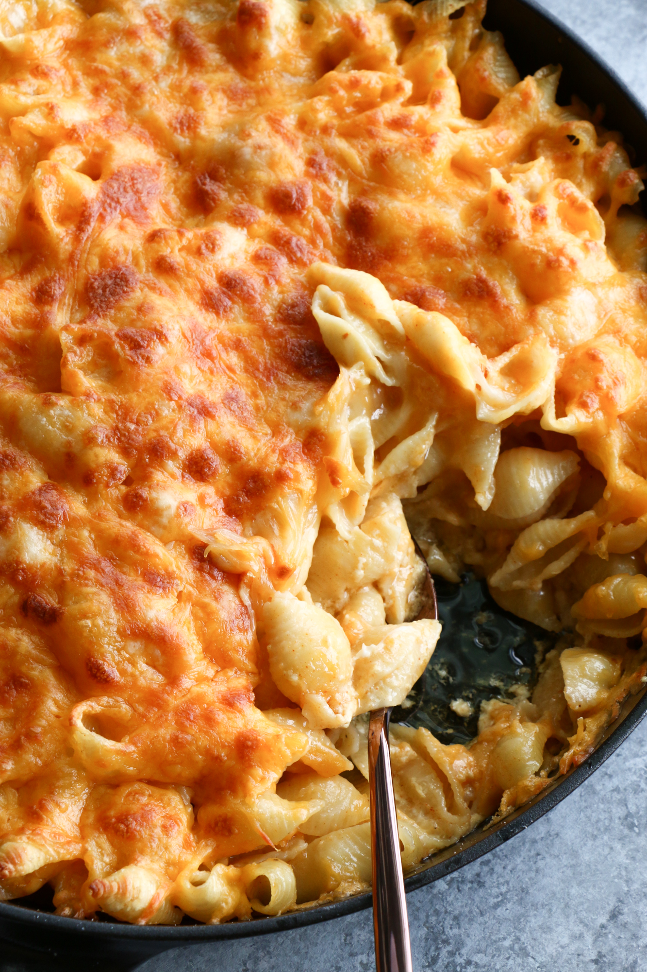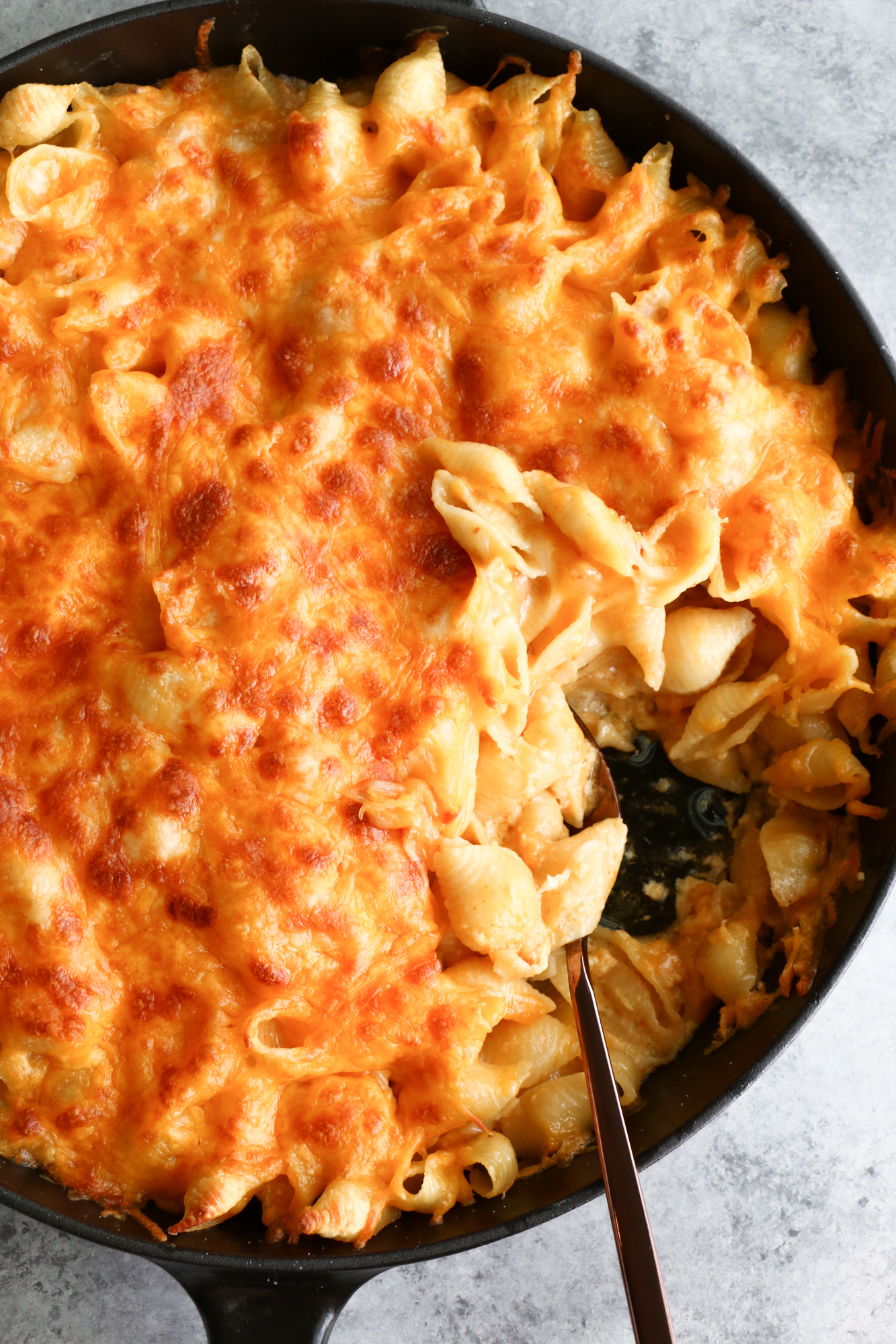 - Pour the shell pasta mixture into a large sized cast iron skillet or baking dish, spread in an even layer. Top with 1 cup of mozzarella/Colby jack blend. Cover with aluminum foil, transfer to the middle rack of the oven and bake for 30 minutes.
