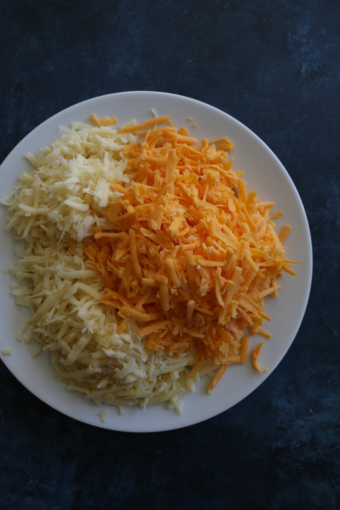 Normally, I would tell you to grate your own cheese. But it’s 2020 and we just survived the hardest year ever. So, these are the pre-shredded cheeses I bought to make this dish. I bought the Sharp Shredded Cheddar Cheese and the Two State Farmers’ Shredded Cheddar Cheese which combines the best of New York and Vermont for a smooth blend of sharp and mild cheeses. I also see they have a mac and cheese shredded cheese which I will have to try next time!