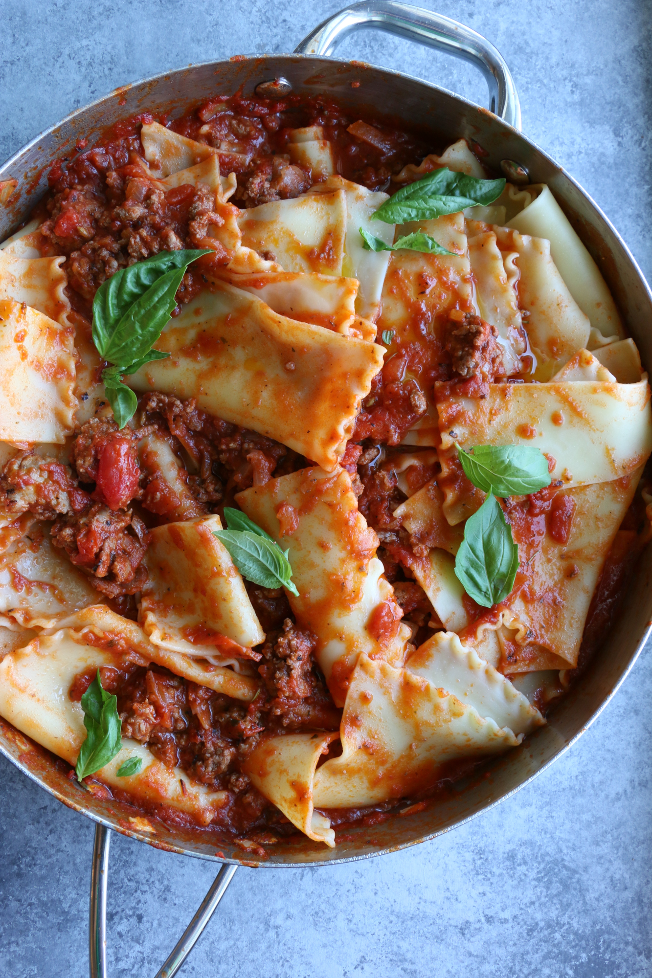 - While your sauce is simmering, bring a large pot of salted water to a boil; add the broken lasagna pasta, a handful at a time. Cook for about 10 minutes, stirring frequently, or until al dente. When the sauce is ready, add the cooked broken pasta directly into the pan and carefully toss together. Sprinkle on some fresh basil leaves, serve and enjoy!