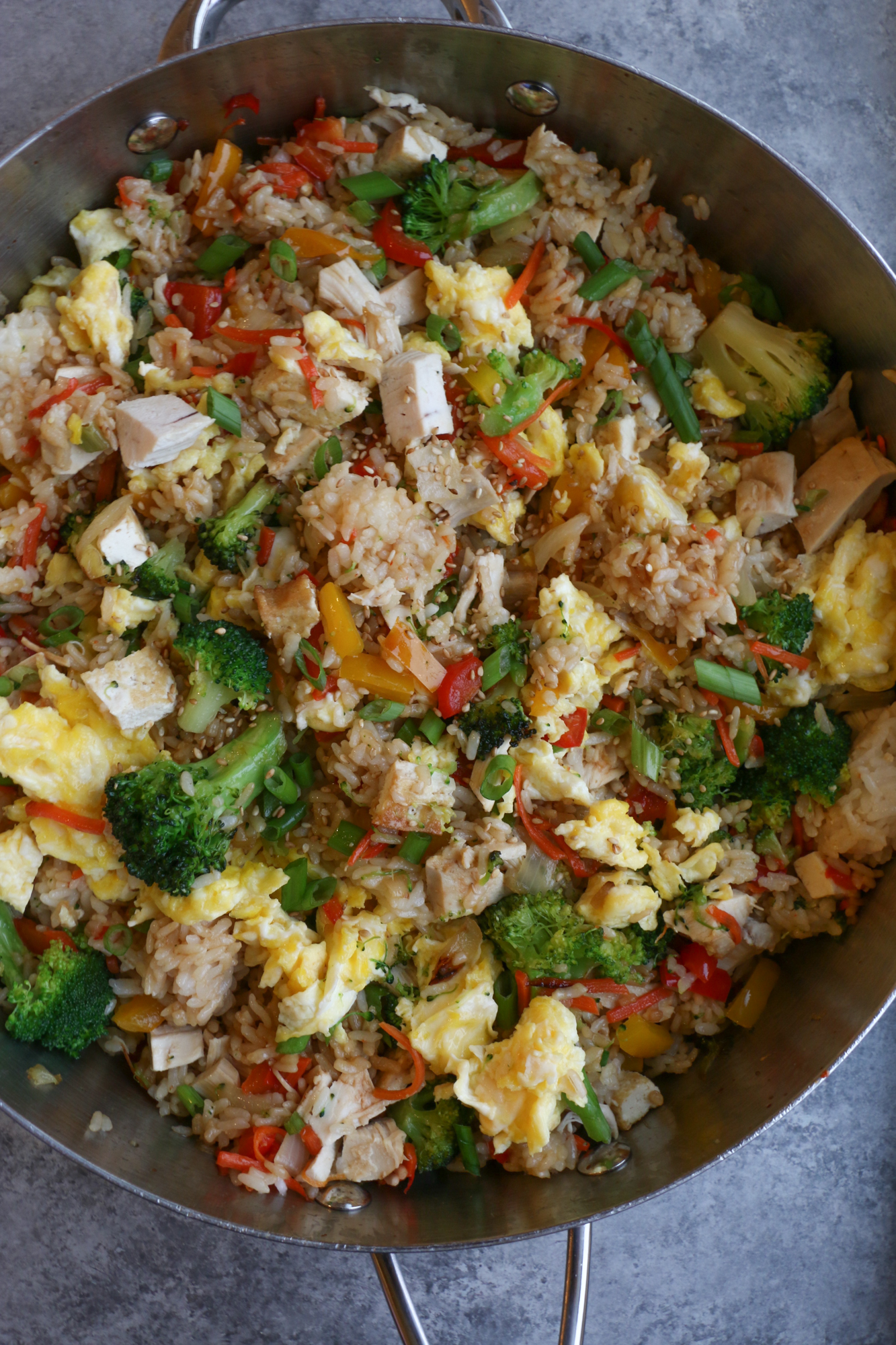 - Add the chicken and the tofu (or any cooked protein) and toss together again. Lastly, add in the cooked eggs and gently mix together in the fried rice. Garnish with green onions and sesame seeds if desired and serve! Enjoy immediately.