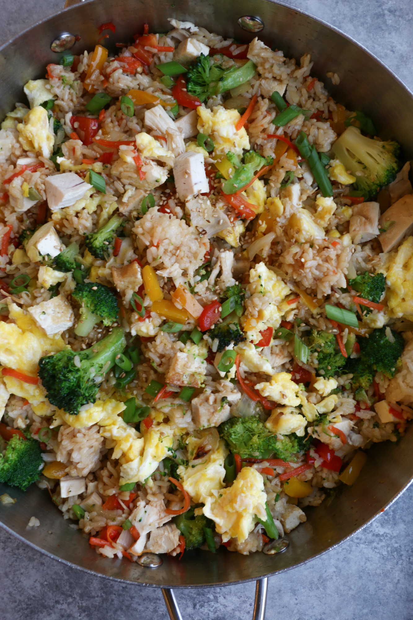 - Add the chicken and the tofu (or any cooked protein) and toss together again. Lastly, add in the cooked eggs and gently mix together in the fried rice. Garnish with green onions and sesame seeds if desired and serve! Enjoy immediately.