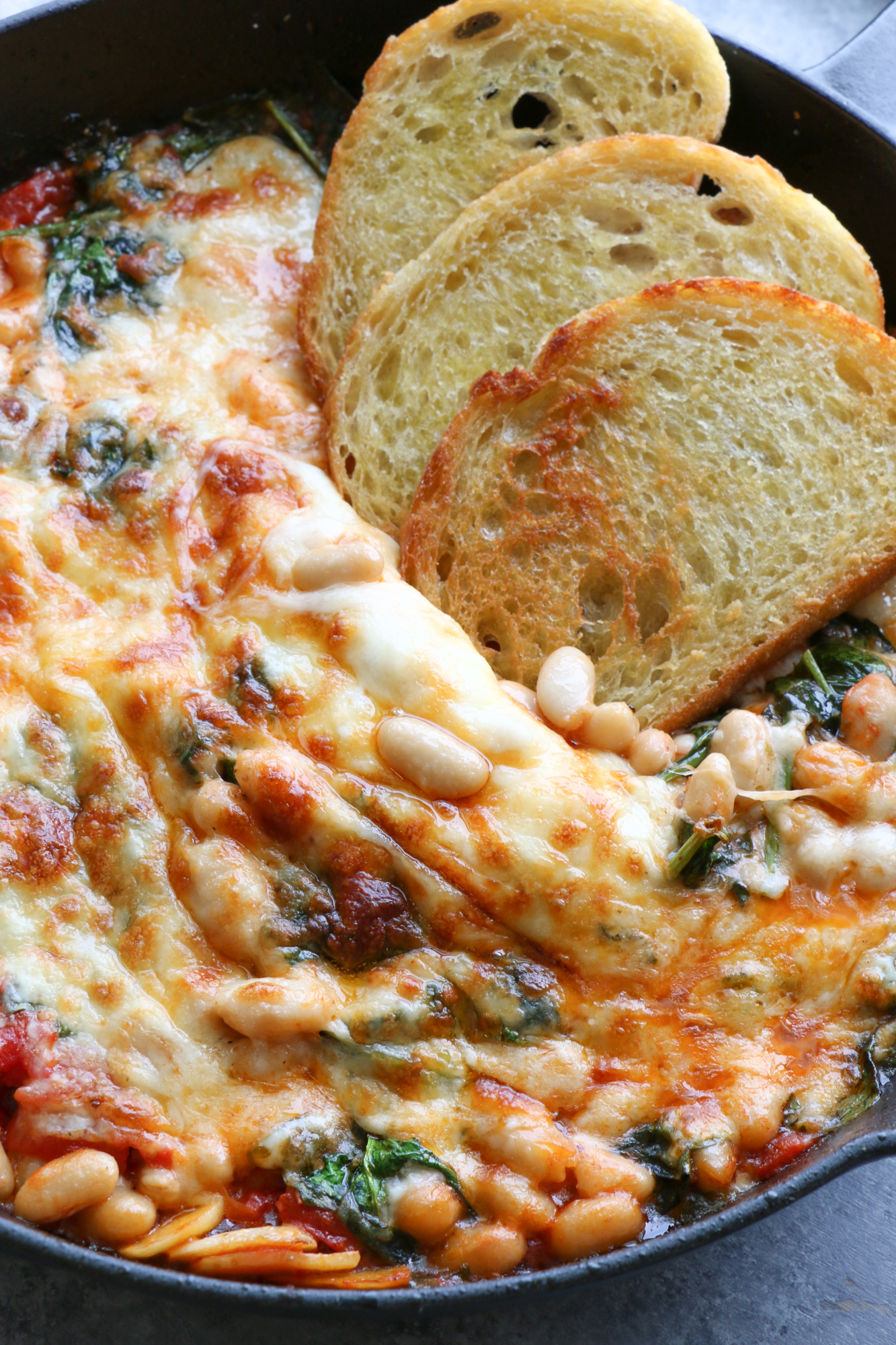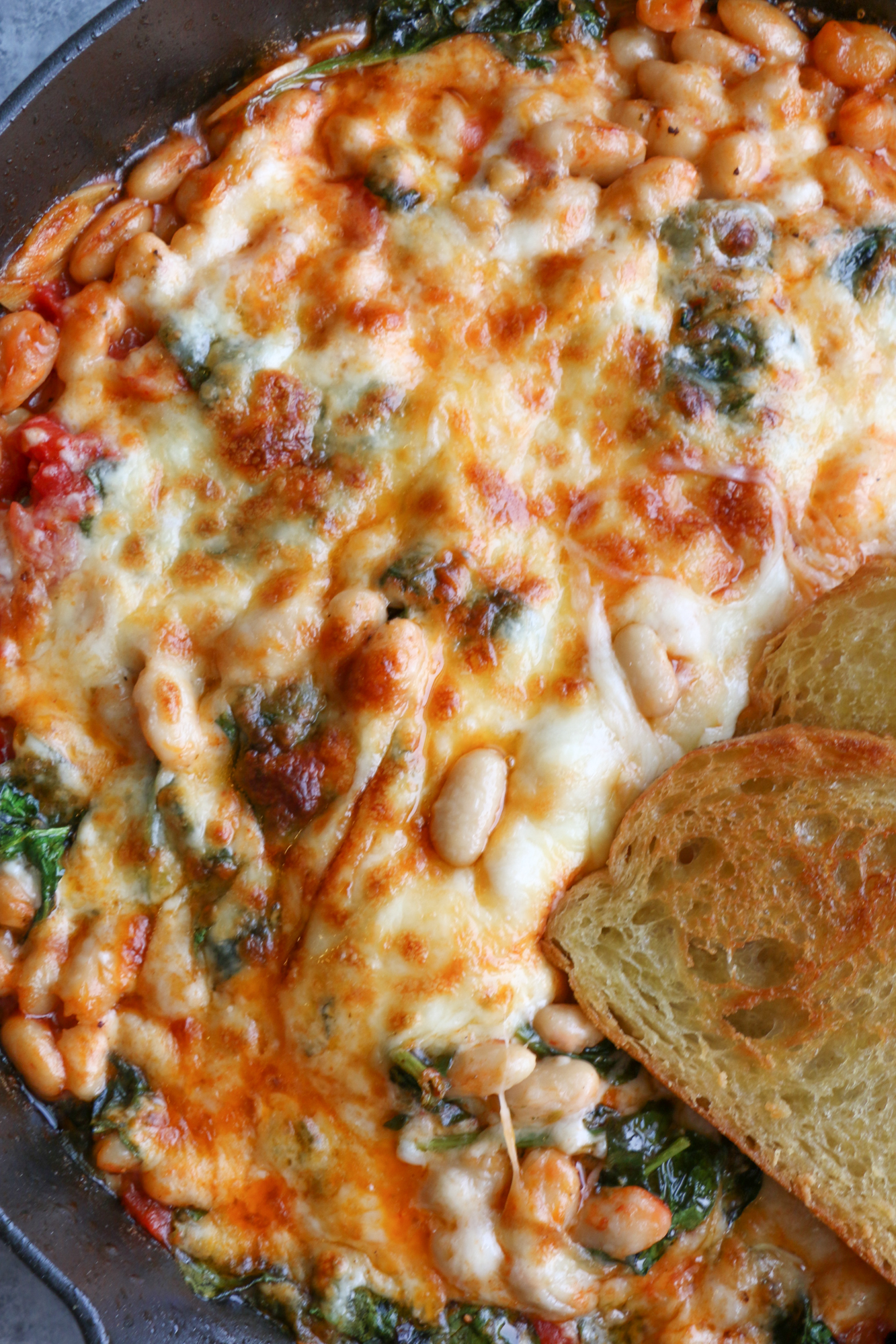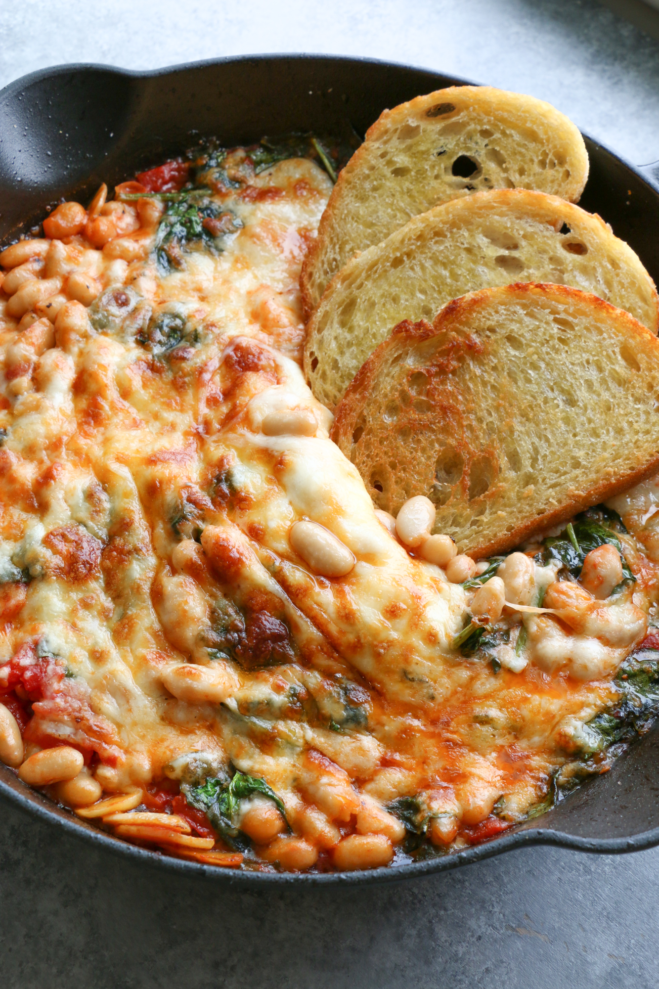 Pinned this about a year ago and finally remembered to make it and omg!! SOOOOOO yummy! I added artichoke hearts that I needed gone, two giant handfuls of spinach and arugula mix, no water, only used one can of beans. I also let them bake under the broiler and paired with a rosemary parmesan sourdough from Costco. Highly recommend!
