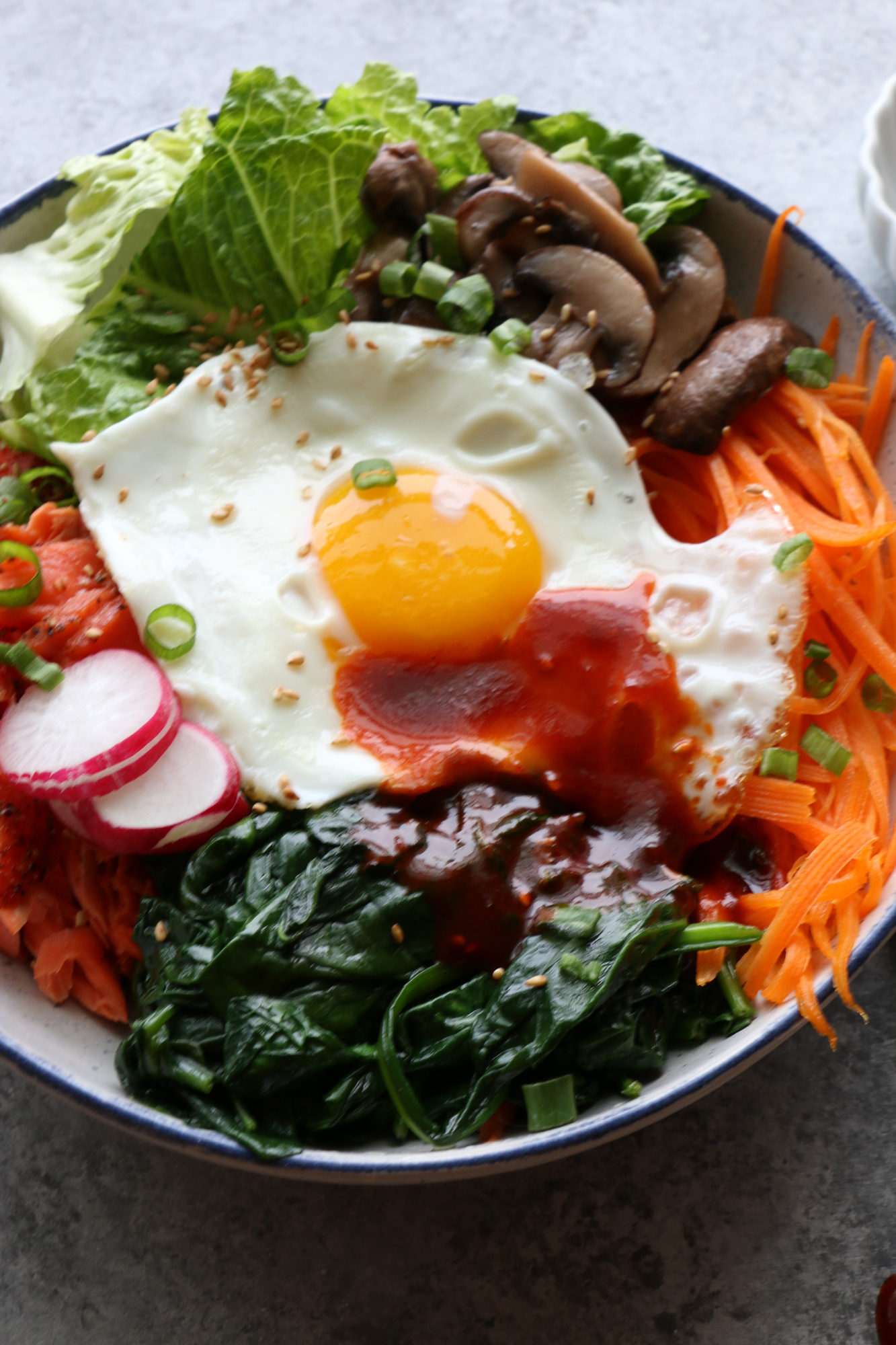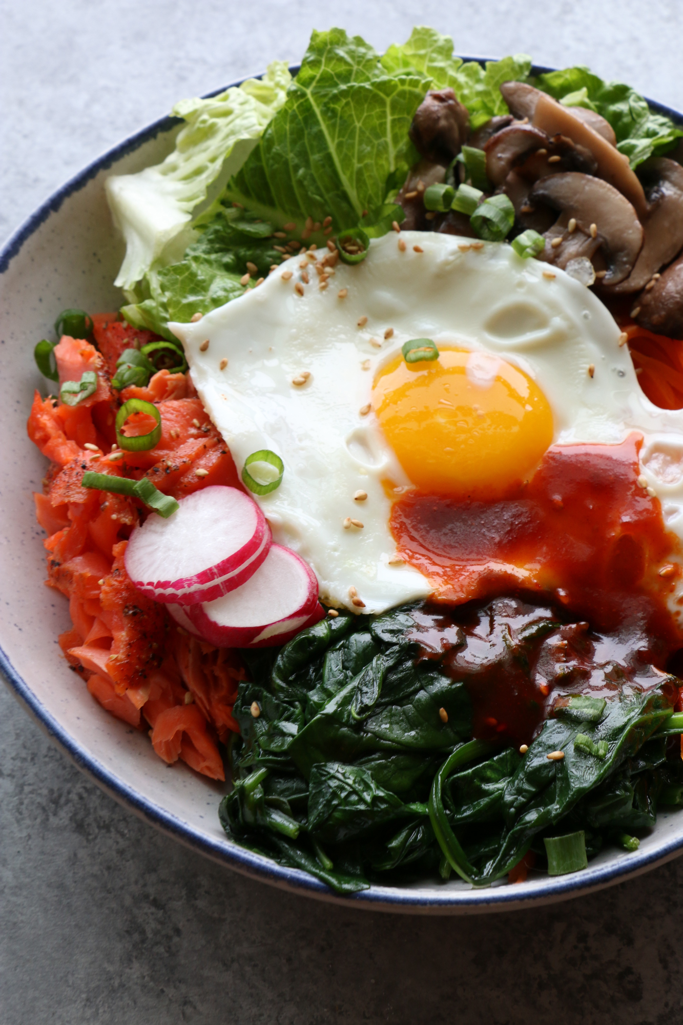 - How to assemble your bowl: place your cooked rice in your bowl. Add some cooked salmon in the bowl. Continue to add in the mushrooms, carrots, spinach and lettuce around the rice in the bowl. Top with a fried egg and garnish with the radishes, green onions and sesame seeds. Serve with the gochujang sauce and enjoy!
