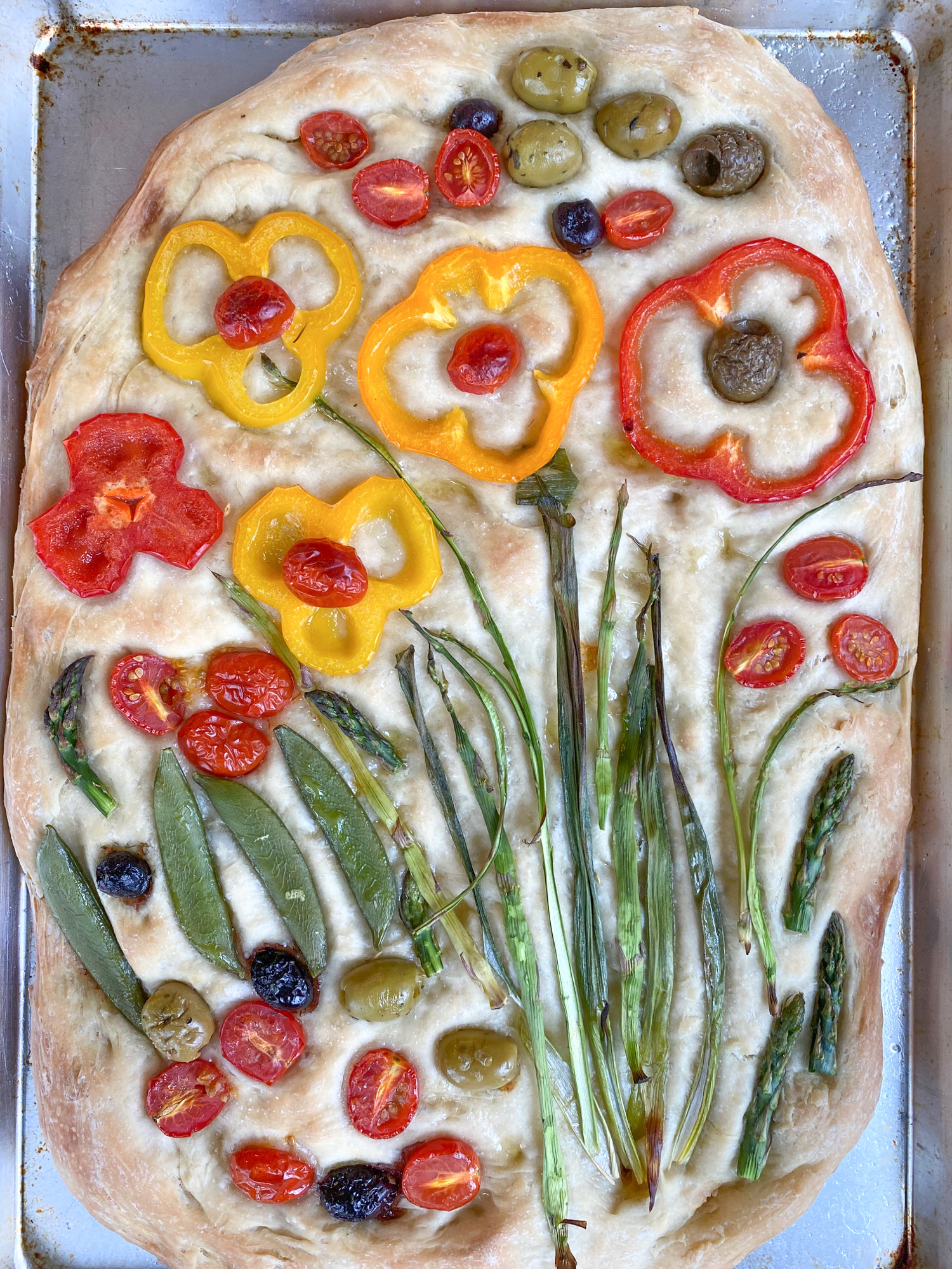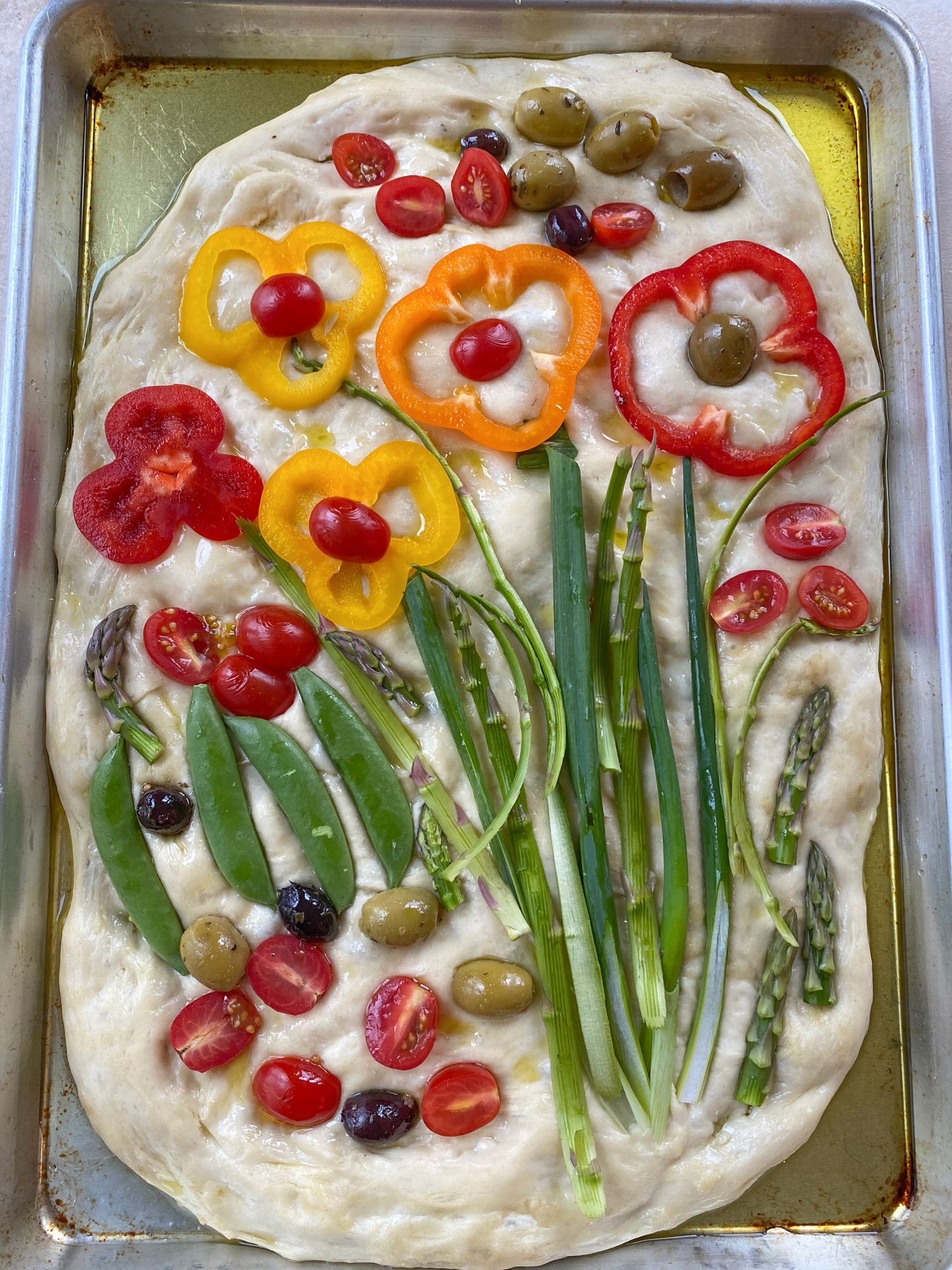 Garden focaccia!! Such a fun and delicious project to do with your kids, or just something beautiful and delicious to serve for any time of the day! This would also be a fun thing to make for MOM for Mother’s Day!