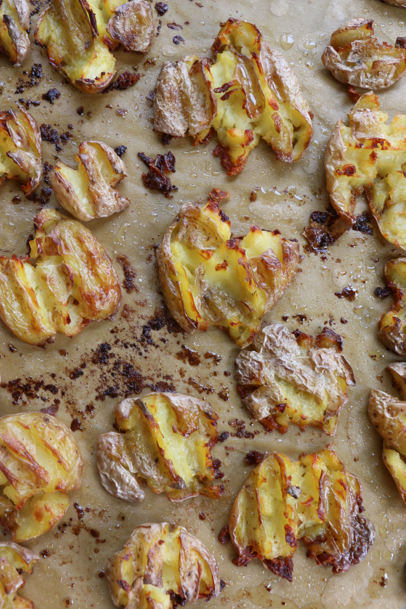 - Dump the potatoes over the prepared baking sheet, and use a potato masher or a fork to gently smash each potato. After smashing, I move them around the baking sheet a little to ensure the bottoms are nicely coated with the olive oil. Drizzle some more olive oil over the top and pour the melted butter on top as well. Season with salt and pepper and bake in the oven for about 45 minutes. Less time if you don't want them too crispy.