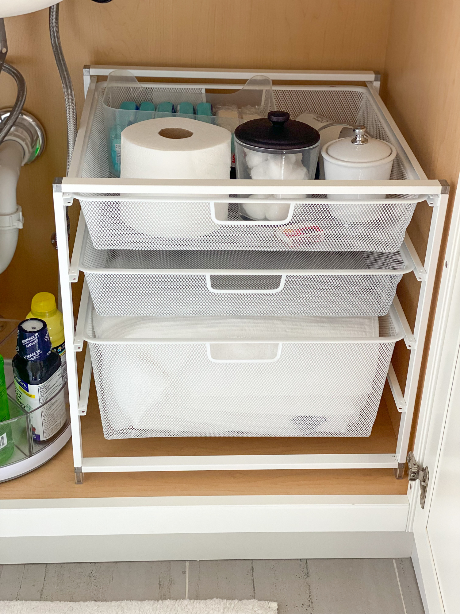 My first project was tackling this under sink space in our guest bathroom. Somehow, I missed adding drawers in this bathroom. I am still shaking my head. What on earth was I thinking? Fortunately, I was able to find The Elfa Cabinet-Sized Mesh Drawer Solution!! The Elfa Cabinet-Sized Mesh Drawer Solution helped me to make this odd under sink space functional and organized.