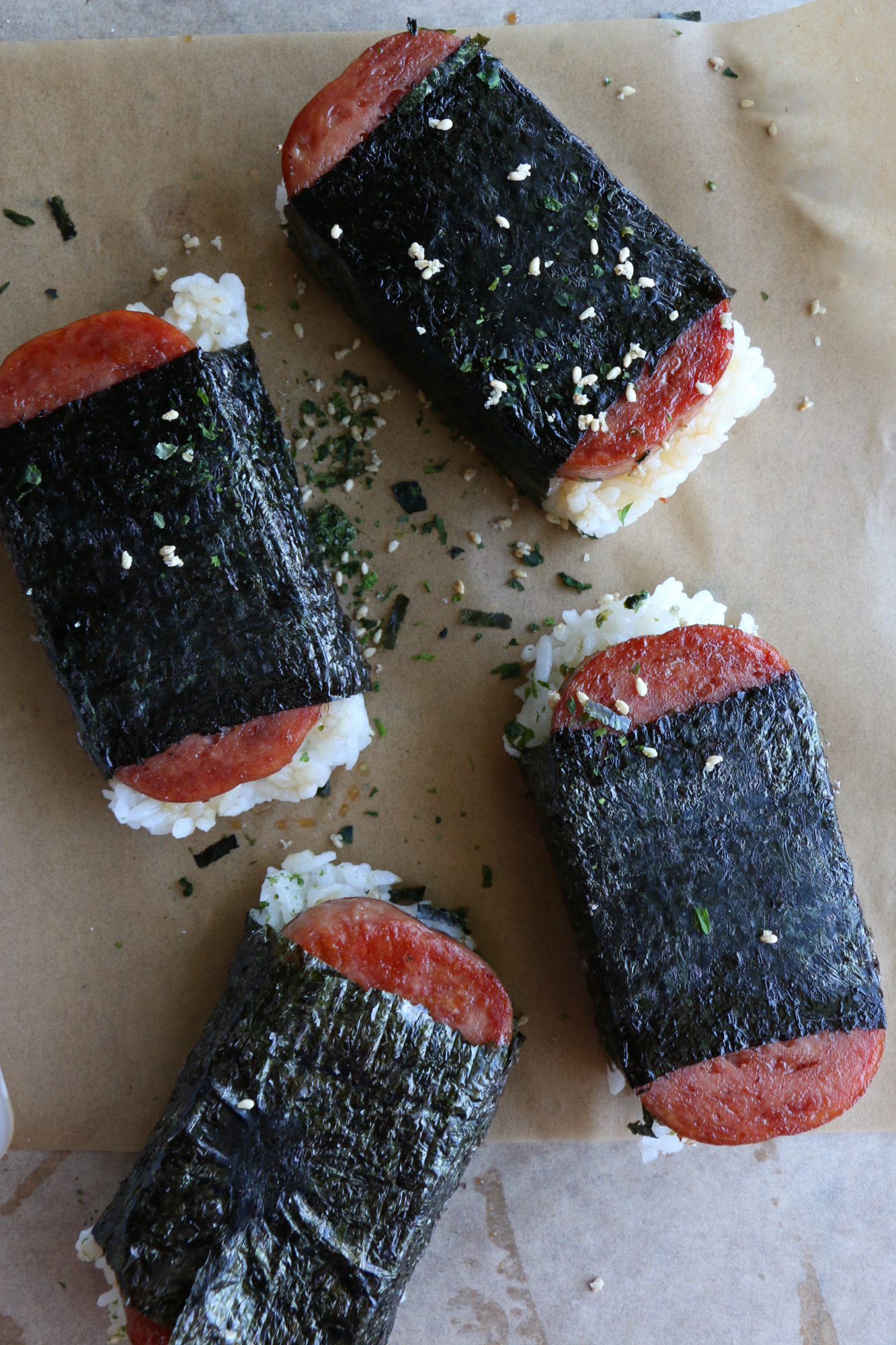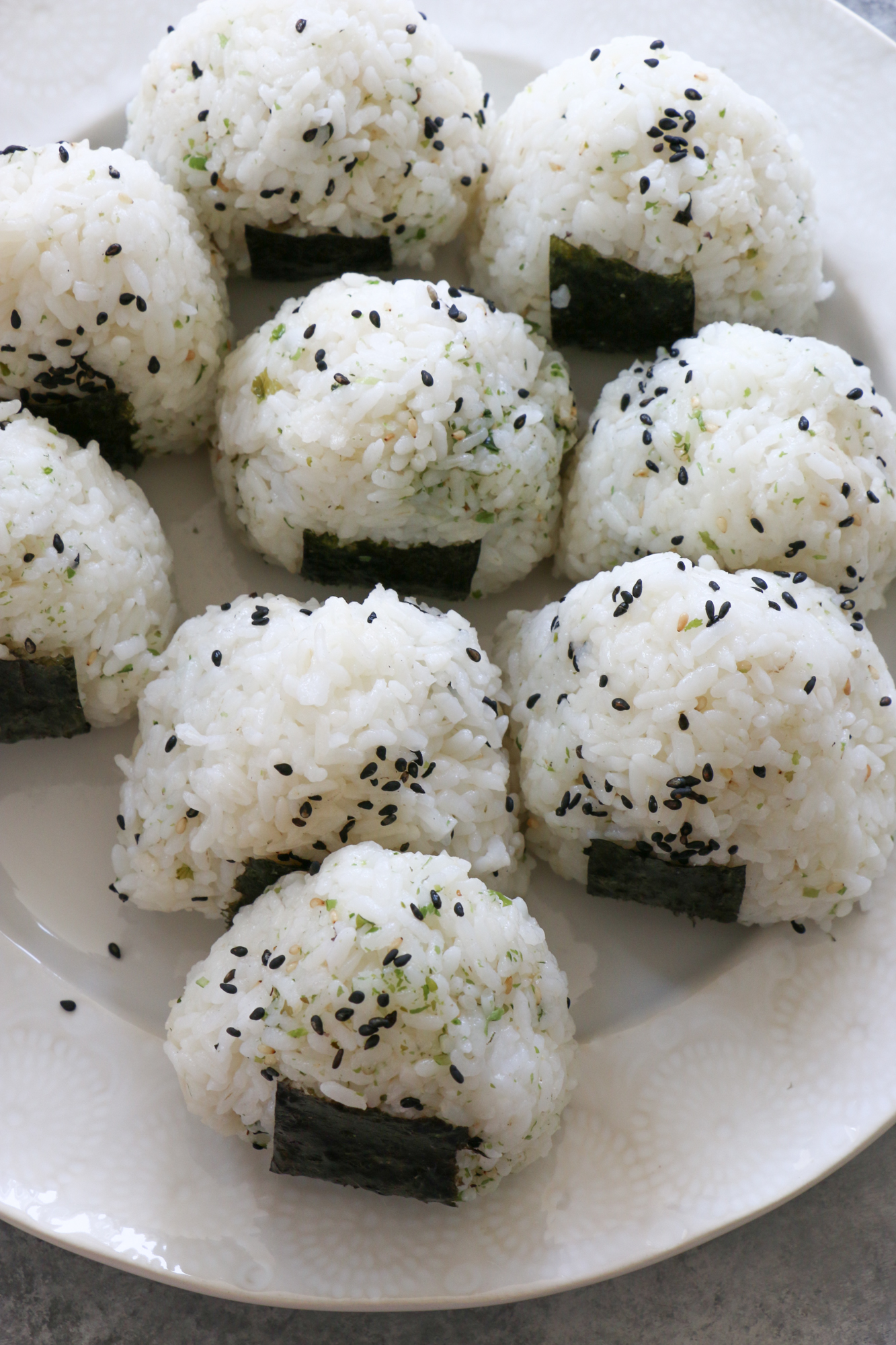 - Place one piece of the nori on the bottom (as shown in the photos) and sprinkle on some sesame seeds if desired. Continue until all of the rice balls are complete. Enjoy immediately or wrap each one individually with plastic wrap. These can be made in the morning and eaten later in the day. They are best eaten day of! Enjoy!