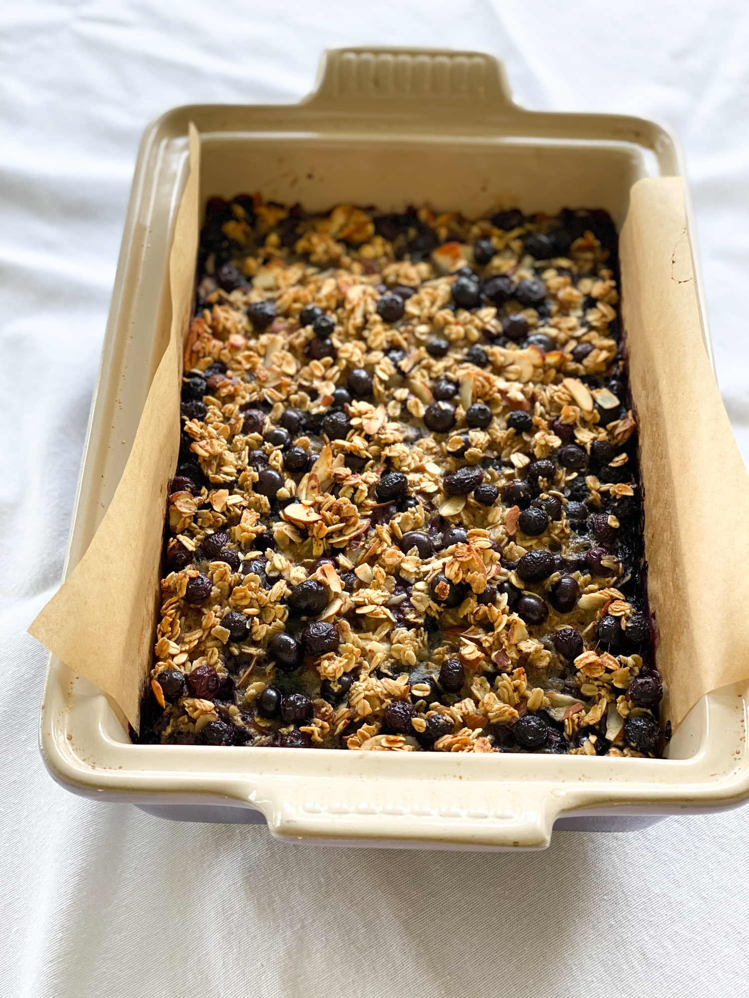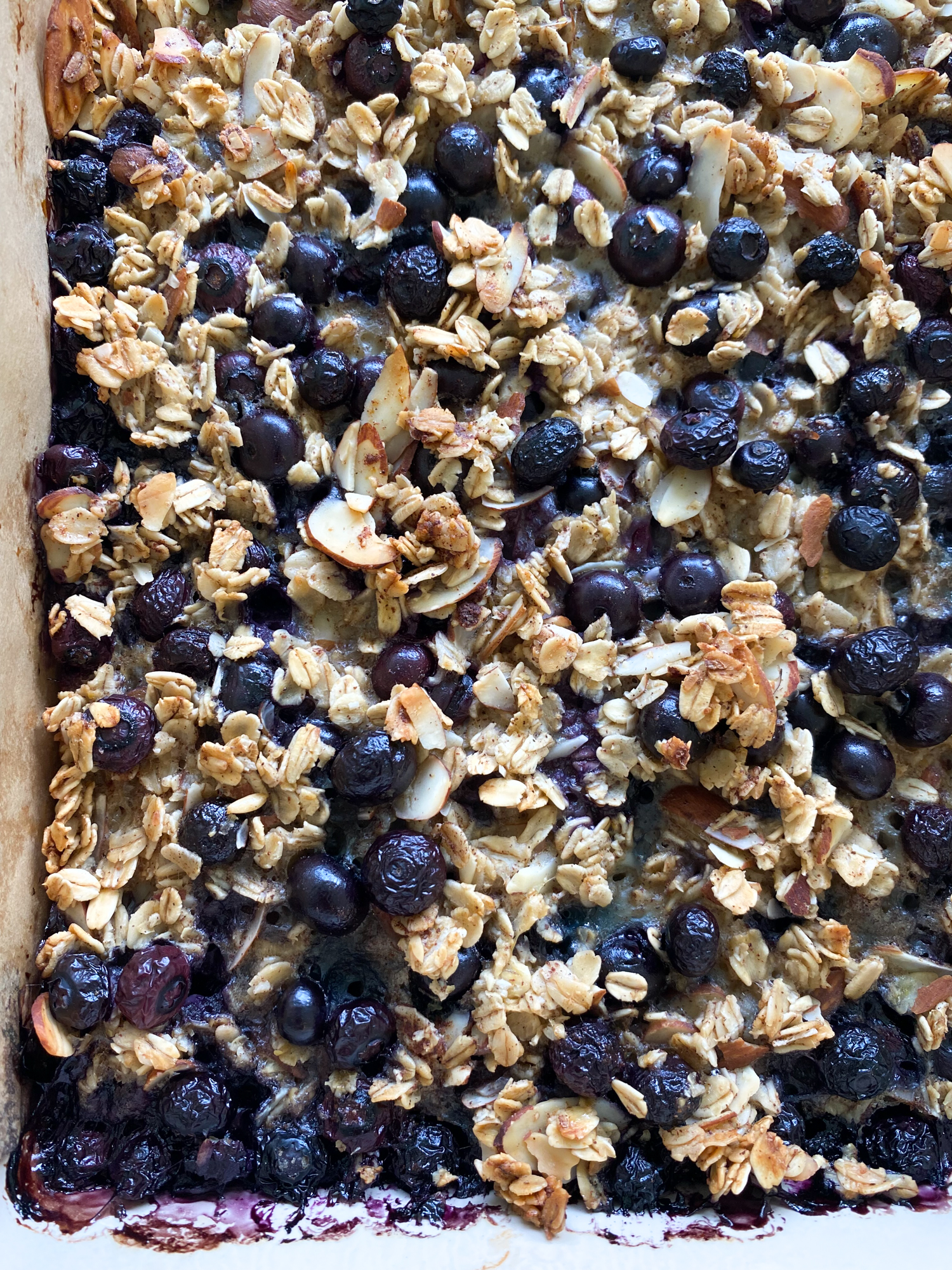 - Preheat your oven to 375 F and grease a 9 x 13-inch baking dish and line with parchment paper. Using a large mixing bowl, mix together the Quaker Old Fashioned Oats, the almonds, cinnamon, nutmeg, baking powder, salt, almond milk, honey, eggs, melted butter and vanilla until combined. Add in 2 cups of the blueberries and mix together one last time.
