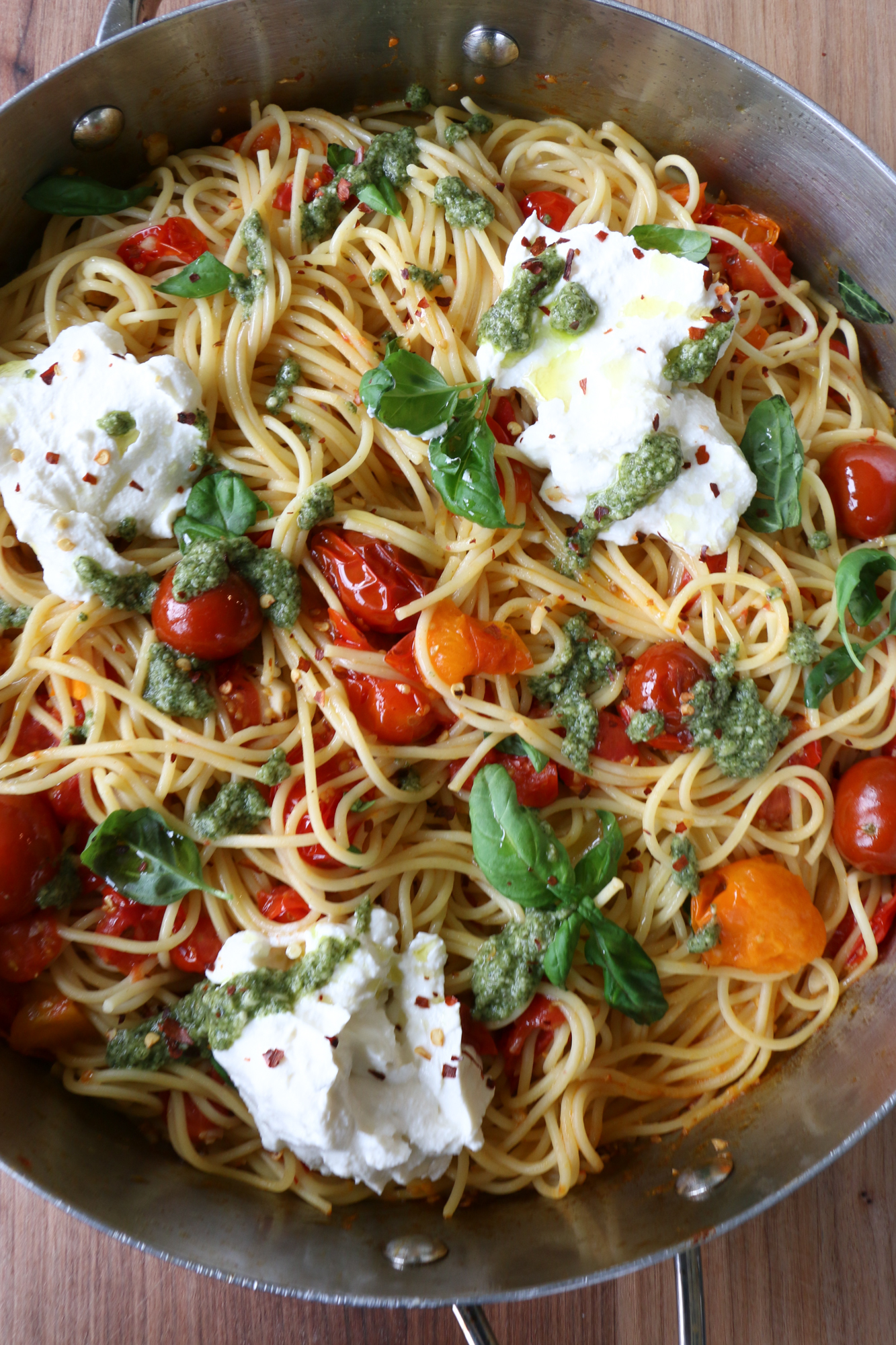 This recipe is completely inspired by this tomato tart. I thought, why not use pasta instead? Any pasta will work for this recipe, and if I let my kids vote: spaghetti is always the winner. What is it with kids and spaghetti? Maybe slurping the long noodles?