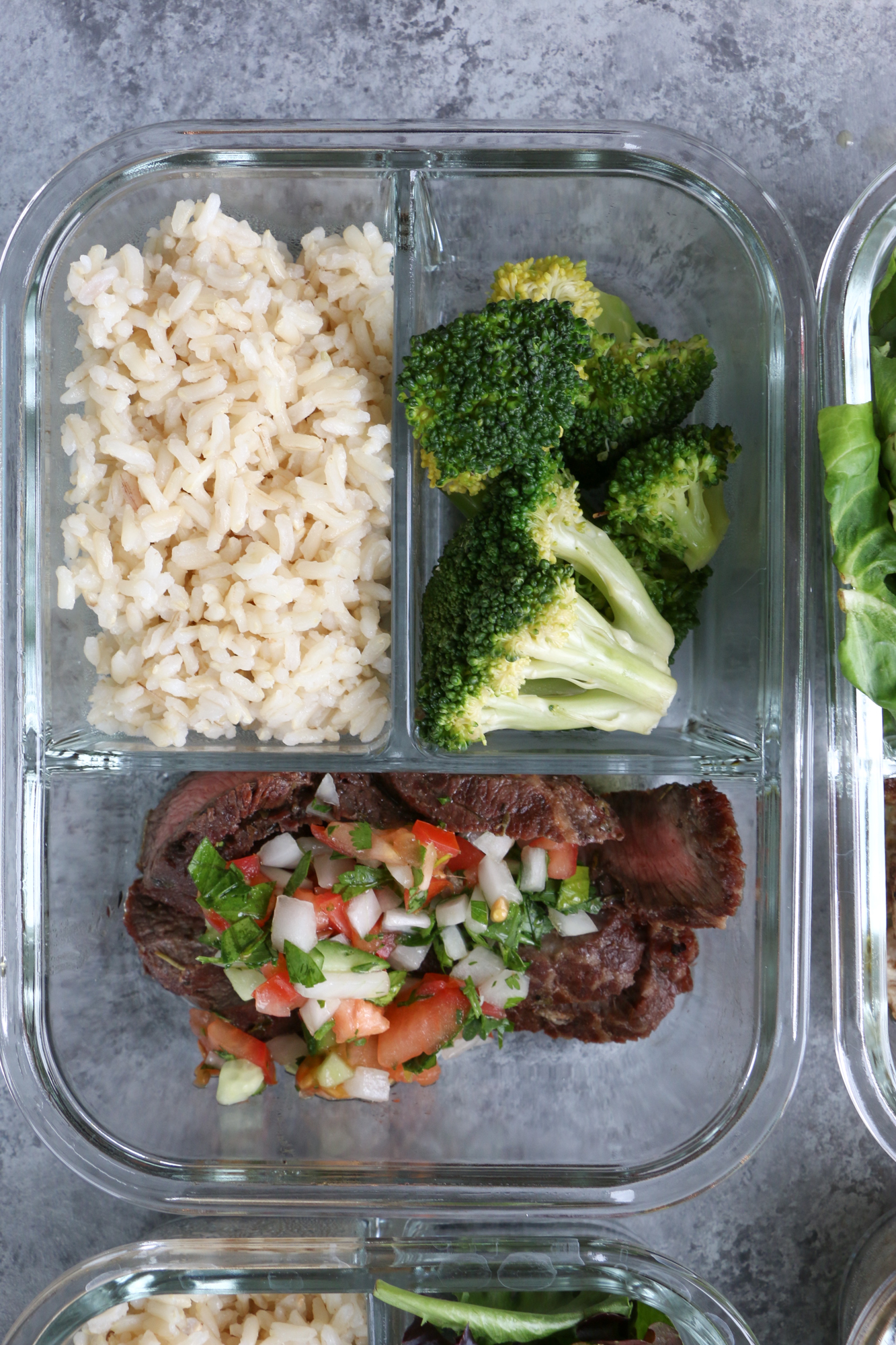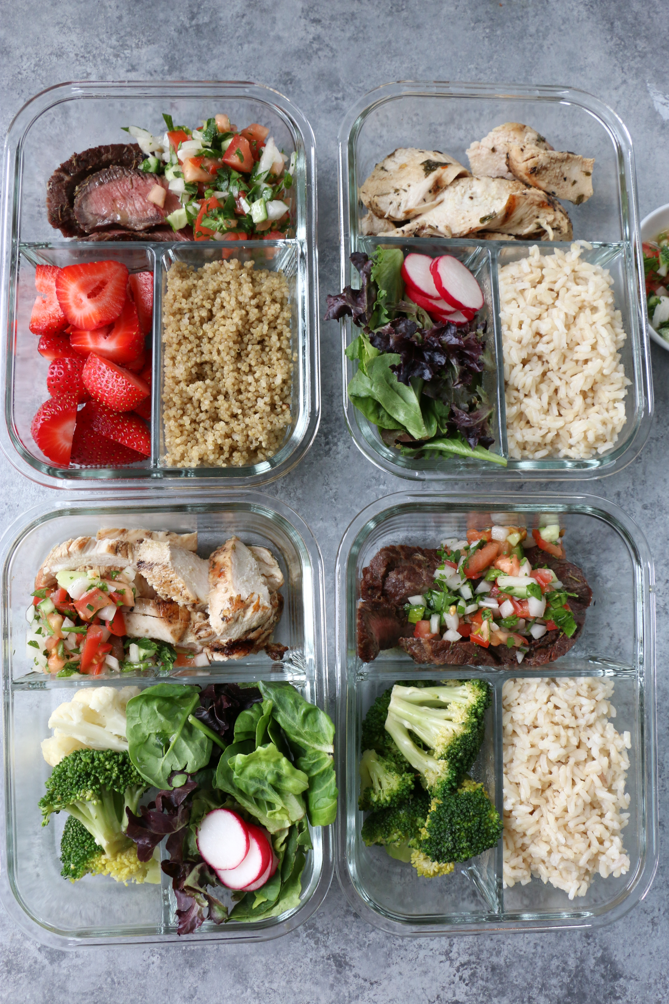 Make Ahead Meals with ALDI: Marinated Flat Iron Steak and chicken with brown rice, quinoa and steamed vegetables.