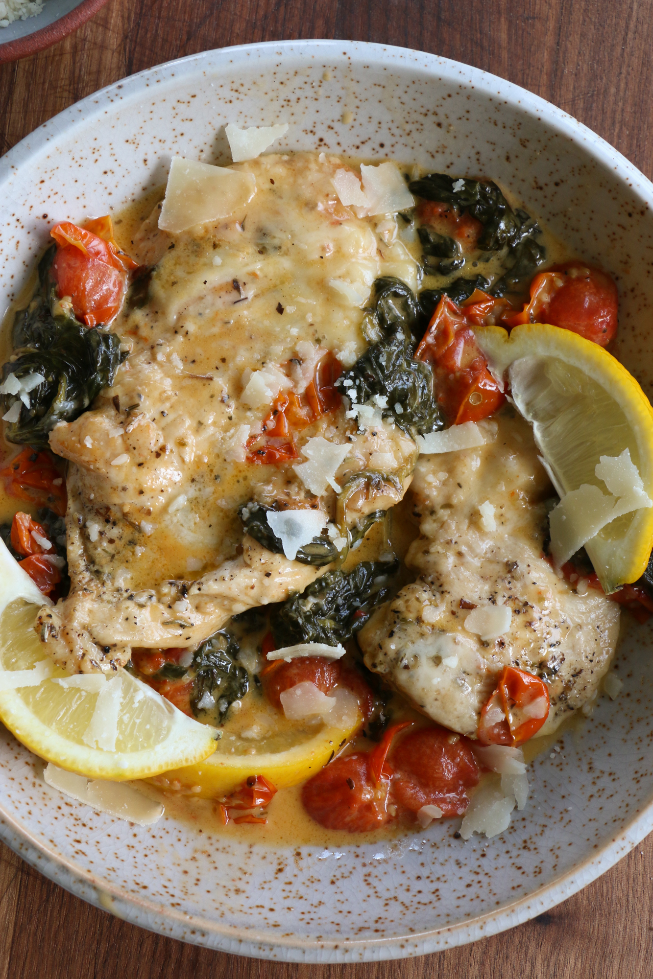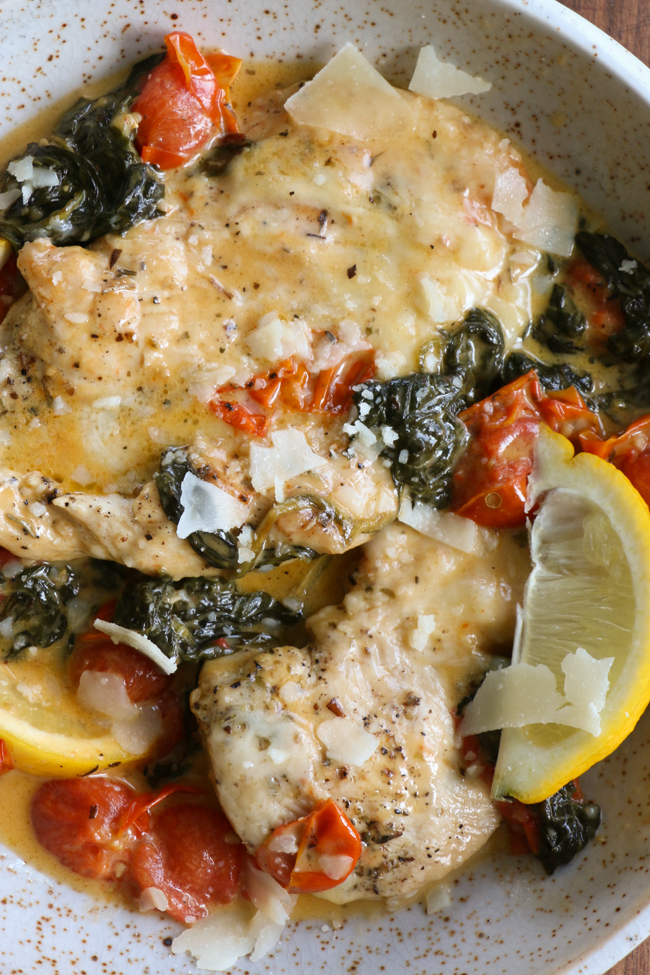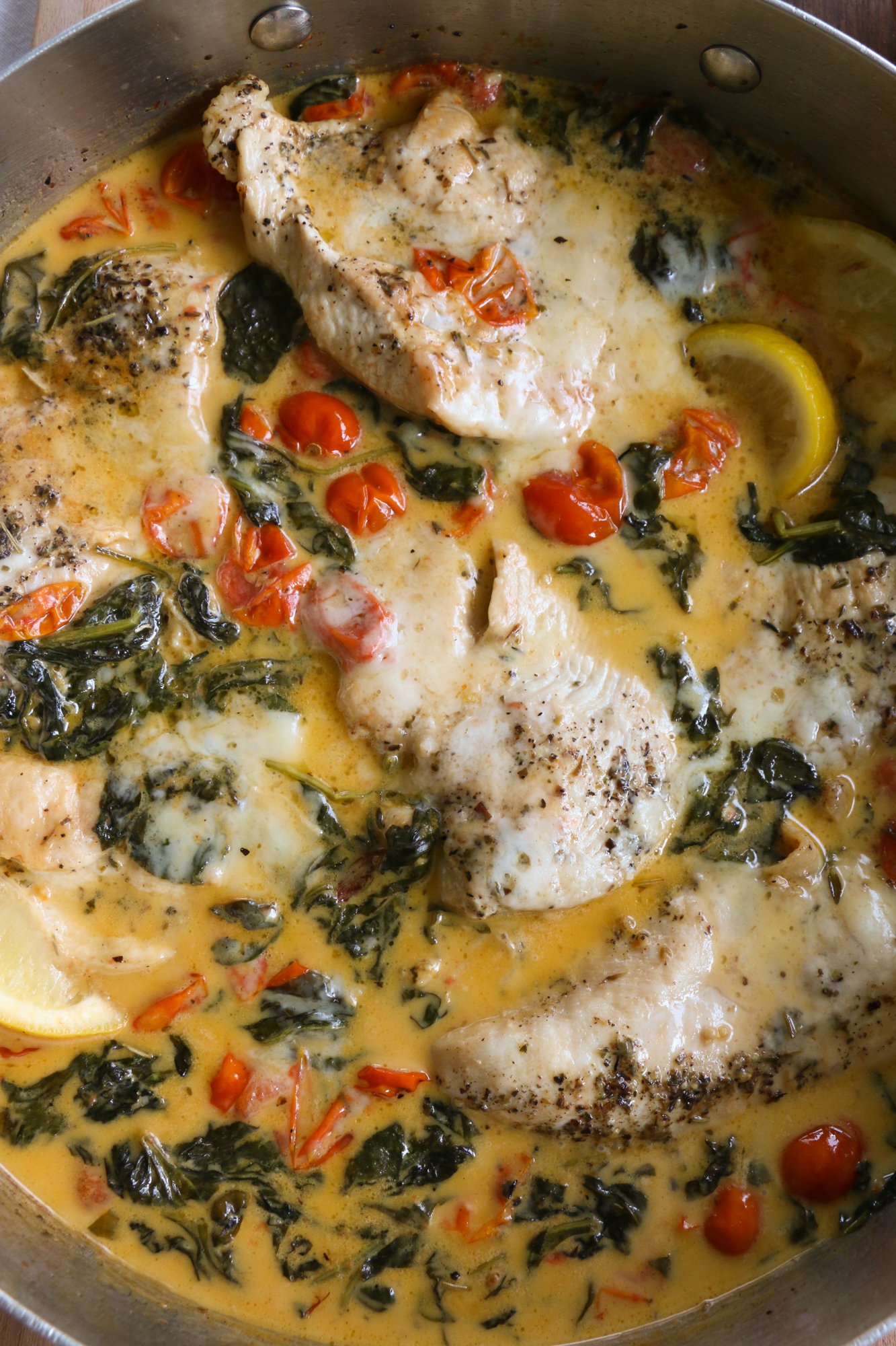 Creamy Tuscan Chicken! Succulent and flavorful chicken bathed in a creamy, cheesy rich sauce. Enjoy this alone, or with pasta, bread or roasted potatoes.