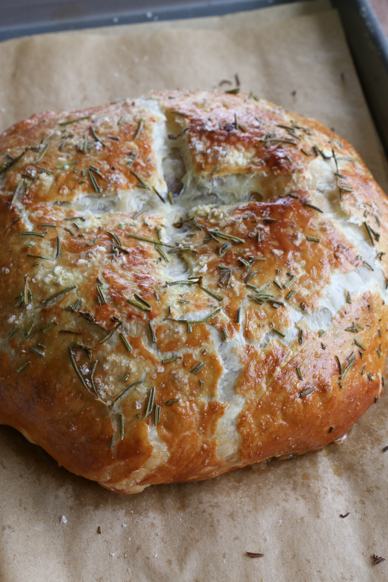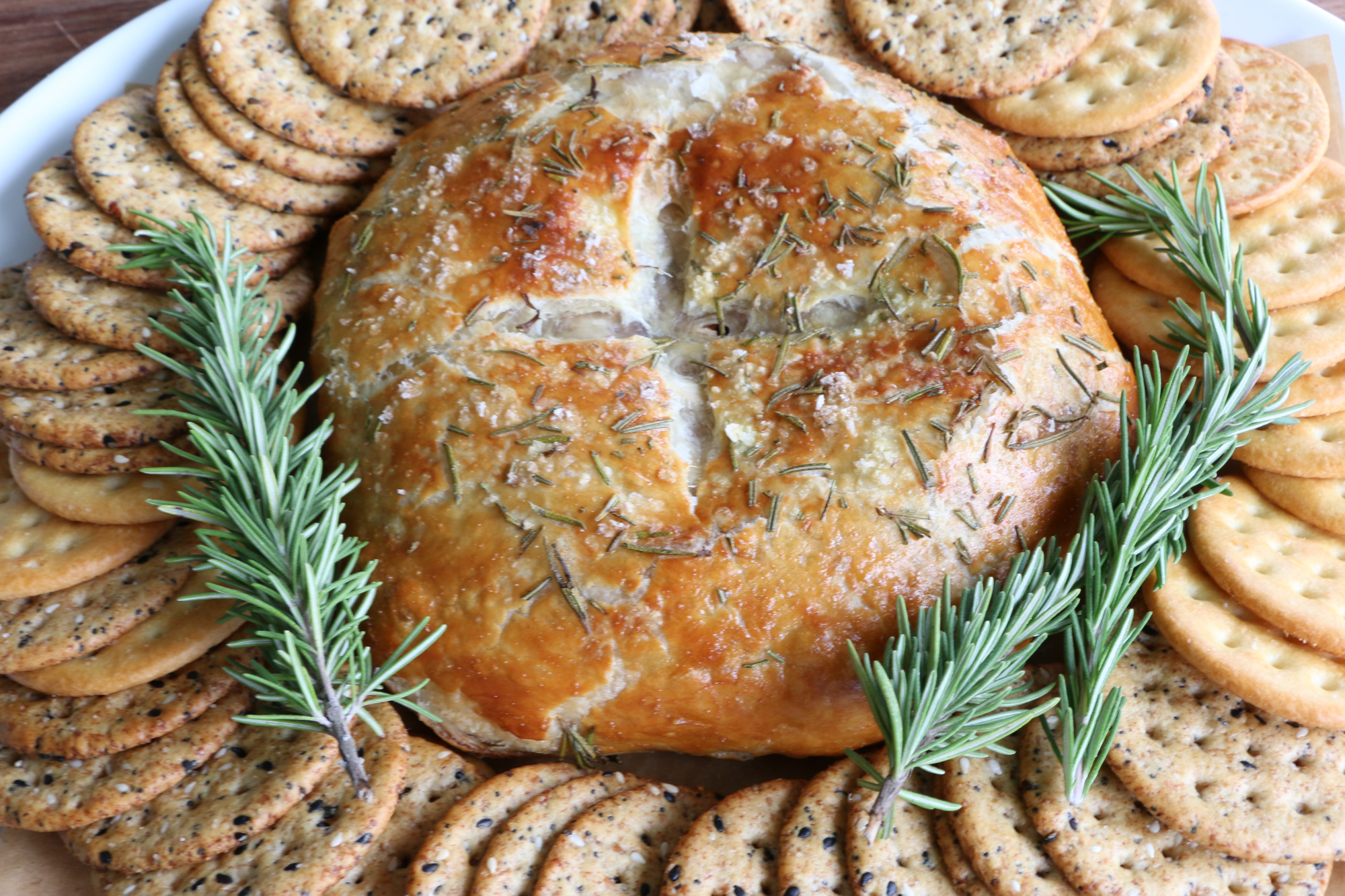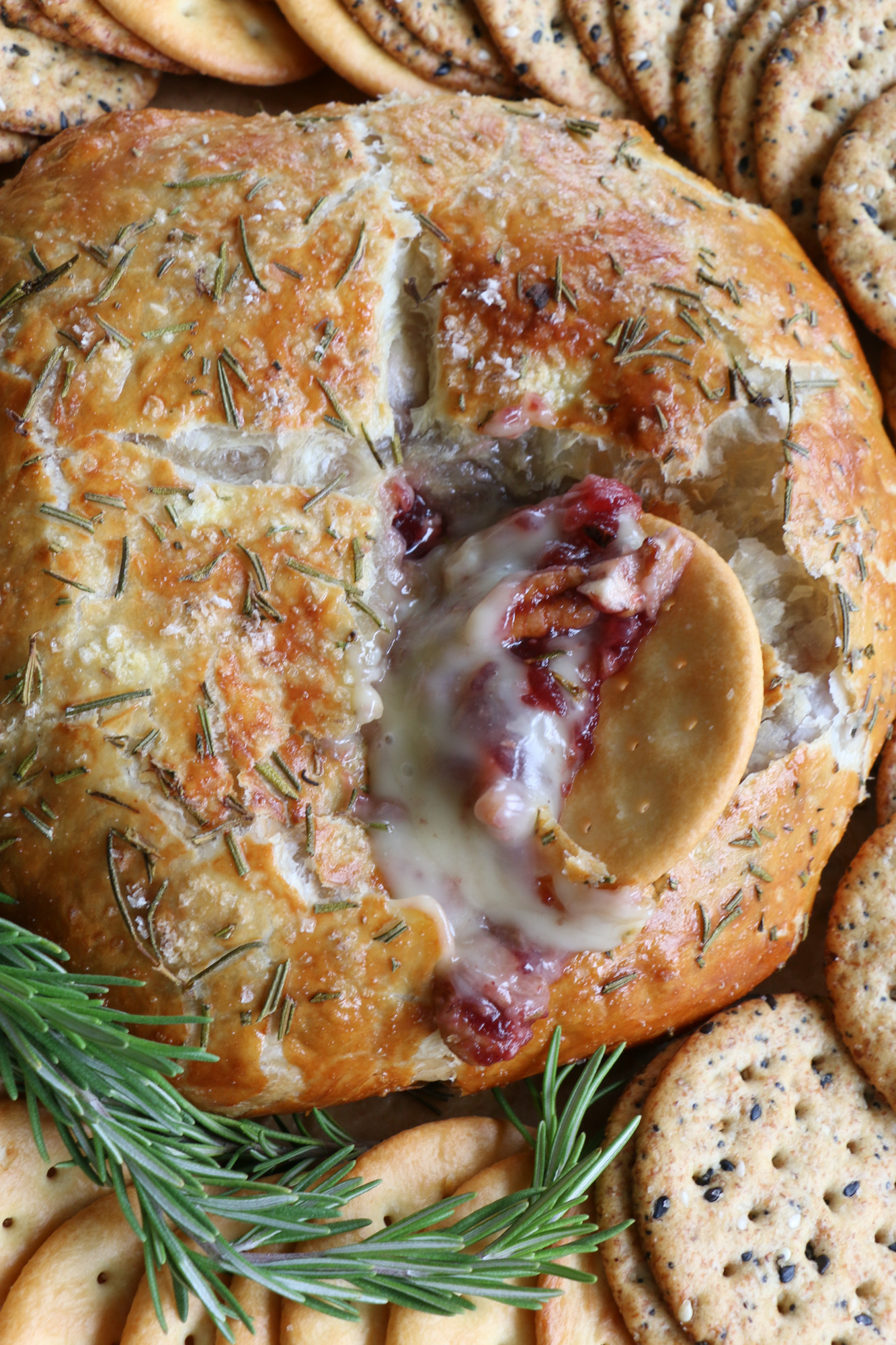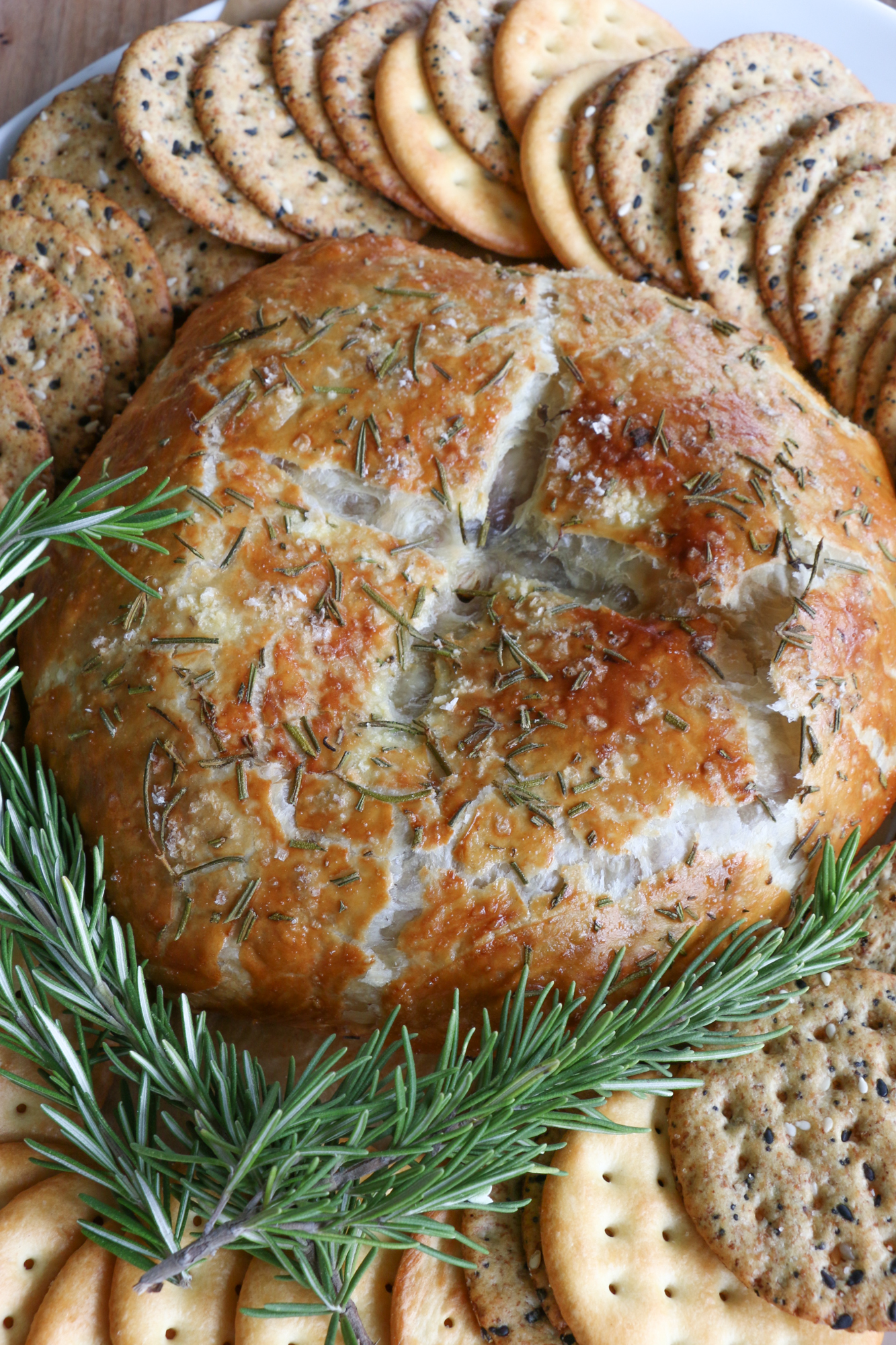 - Unfold the puff pastry over the brie to cover the top, and then carefully flip over and seal to close. Place on a lined baking sheet, fold side down. Brush with the egg wash, and using a sharp paring knife, score the top if desired with an X. Sprinkle on the rosemary and sea salt flakes and bake in the oven for about 25 to 30 minutes. If you want the nicely browned top like I have: at the end of the 25 minutes, switch to the broiler setting and broil for only 2 to 3 minutes to get the top of your baked brie nicely browned. Let cool for 10 minutes before serving. Serve and enjoy!