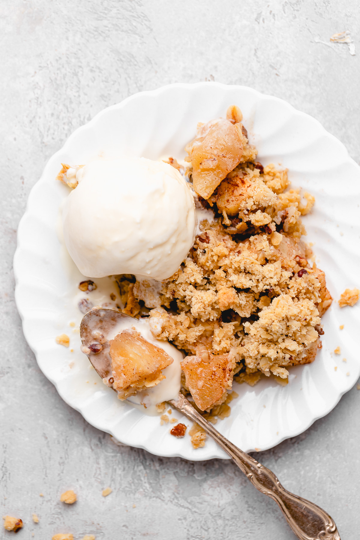 - Spread the crumb topping evenly over the apples into the skillet and bake for about 50 minutes to 1 hour, or until golden brown and bubbly. Serve warm and enjoy!