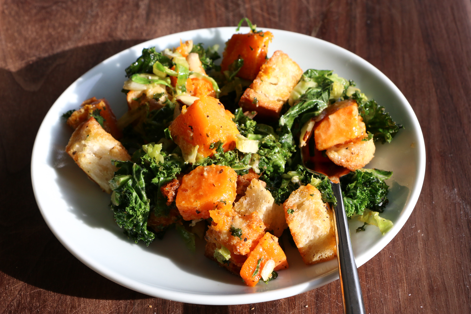 I had some leftover roasted butternut squash and some bread and this happened. I also roasted some kale and shaved Brussels sprouts for even more veg, and topped everything with my go-to salad dressing: my Dijon vinaigrette. I threw in some sliced almonds but candied pecans and/or pomegranate arils would be so lovely in this salad! Next time, I think I’ll add some smoked paprika to the butternut squash to change up the flavor profile and add some heat. See, the possibilities are endless.