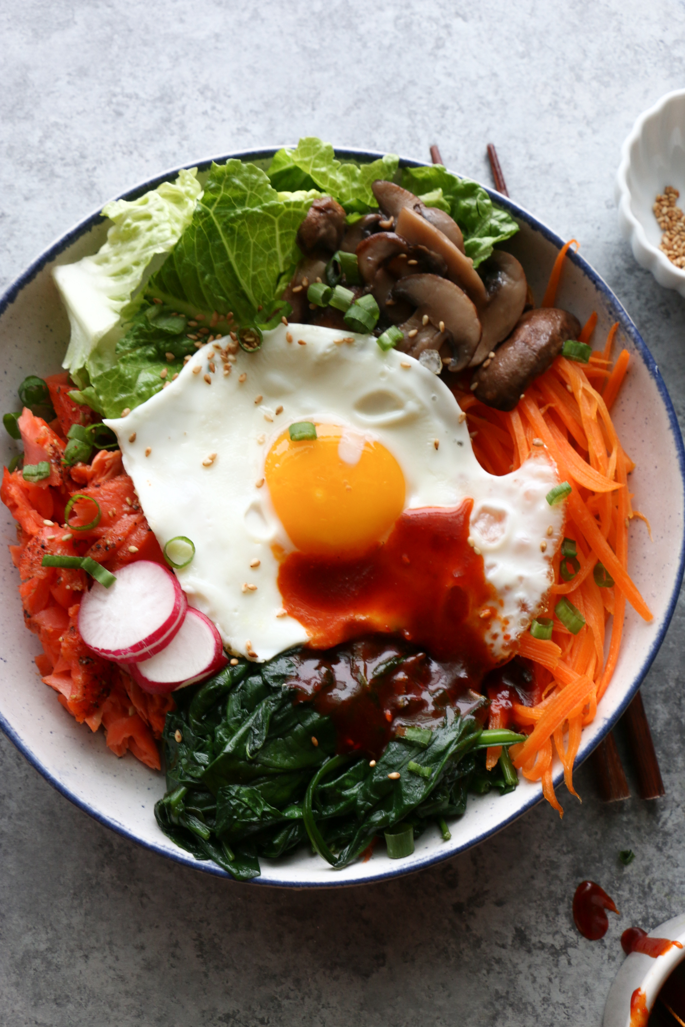 - Bibimbap: Bibimbap just means mixed rice. It is served in a bowl with rice, with bulgogi (or, in most cases, other protein options), sautéed and seasoned Korean vegetables, and a gochujang (Korean red pepper paste) mixture and topped with a fried egg. You simply combine everything together in your bowl just before eating. You can have this hot, served in a sizzling hot stone bowl, or plain.