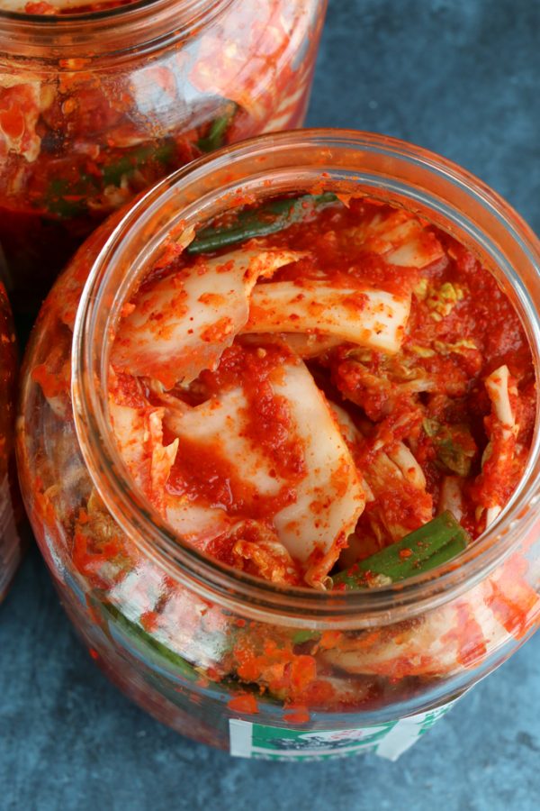 - Kimchi: Korean fermented cabbage. Kimchi, a staple food in Korean cuisine, is a traditional side dish of salted and fermented vegetables, such as napa cabbage and Korean radish, made with a widely varying selection of seasonings: including gochugaru, green onions, garlic, ginger and more. There are many different types of kimchi and people prefer kimchi in different ways: fresh, more fermented or really really funky. It’s spicy, savory and oh so delicious. This is my aunt’s recipe. It’s soooo good. Now, truth be told: it’s not easy to make kimchi at home. It’s not a hard process but it requires certain containers or equipment and time. So, because of that I completely support buying your kimchi from your local Asian market or Korean grocery store.