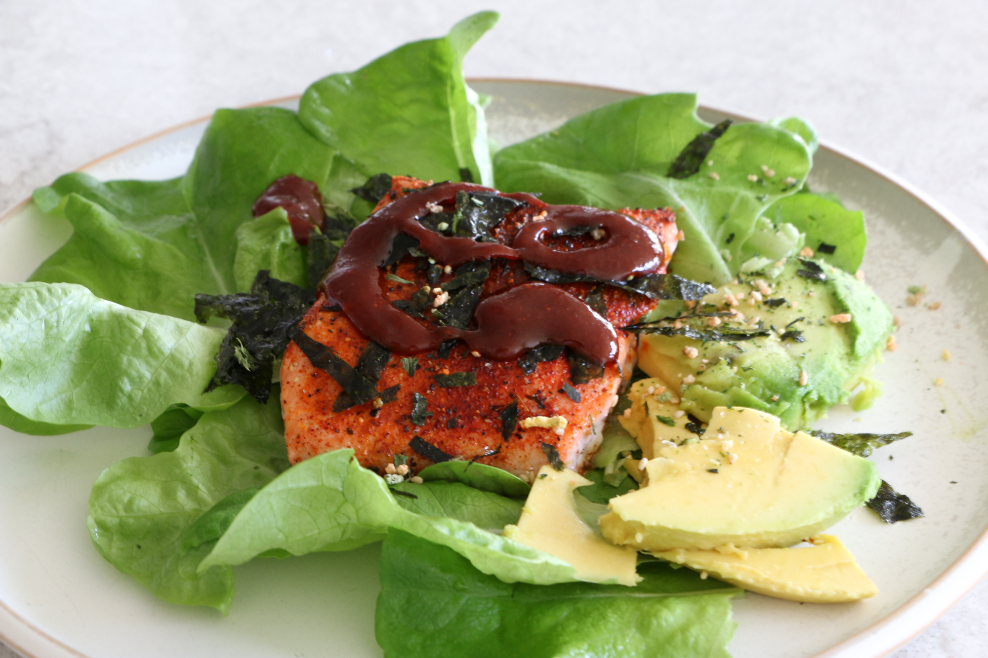 - Remove from the oven and make lettuce wraps. To assemble: place cooked salmon and avocado into lettuce. Season with shredded gim and furikake (if desired) and drizzle on the gochujang mixture (the gochujang, honey, sesame oil and vinegar whisked together). Enjoy!