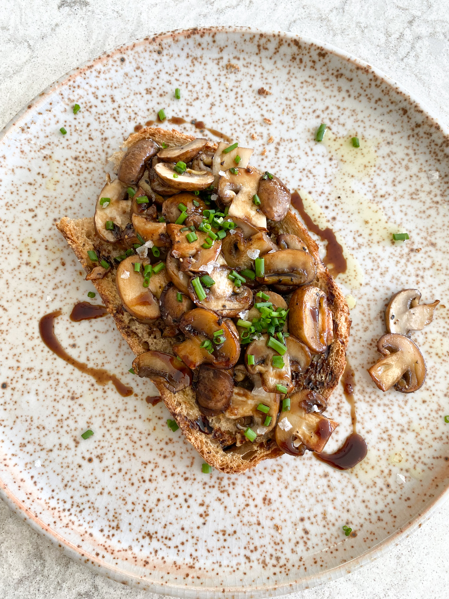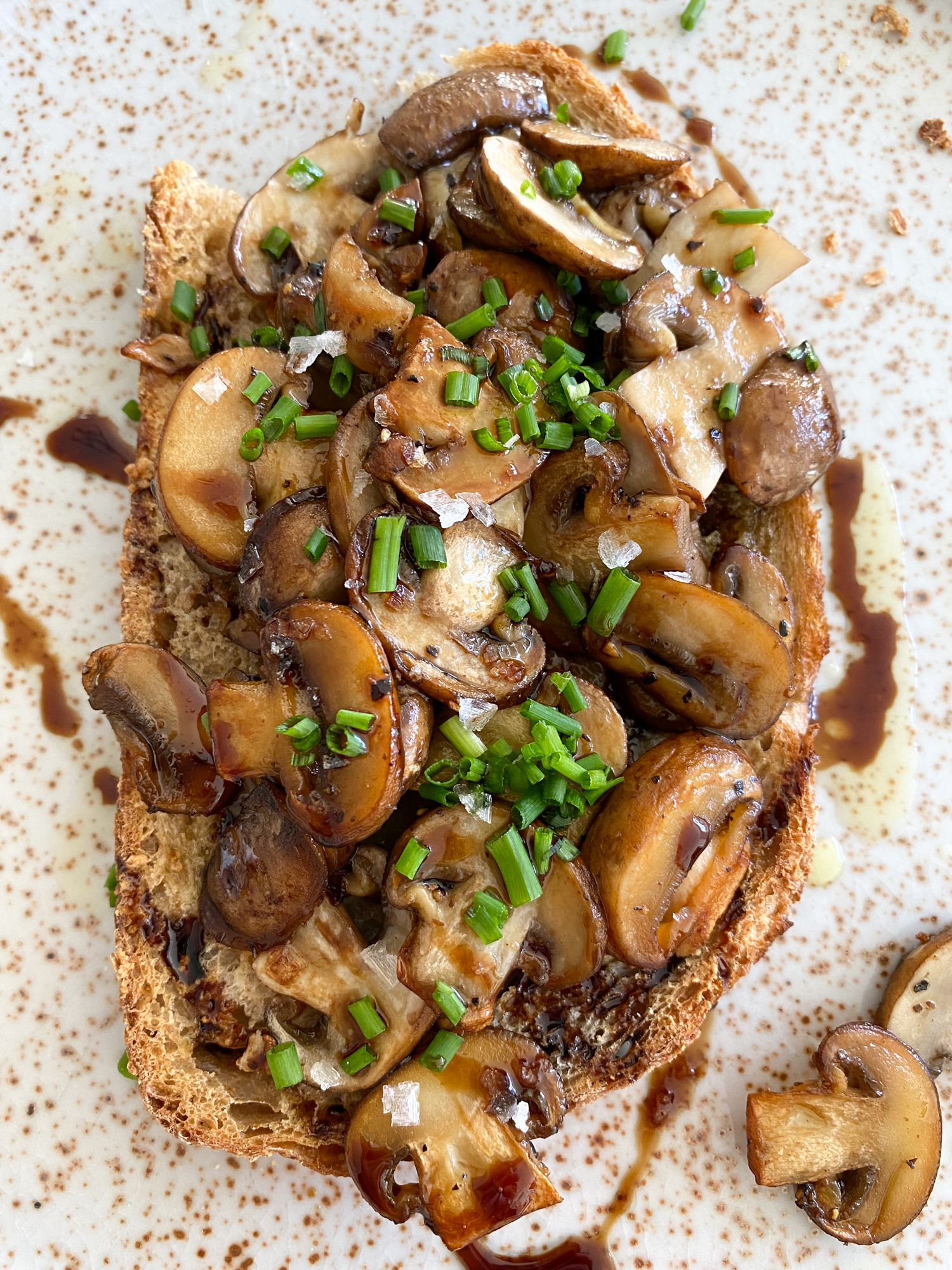 - While your bread slice is still hot from the toaster, rub on the garlic. Spread on some butter if desired. Top with the sautéed mushrooms and drizzle balsamic glaze over the top. Sprinkle chives and Maldon sea salt flakes to finish. Enjoy!