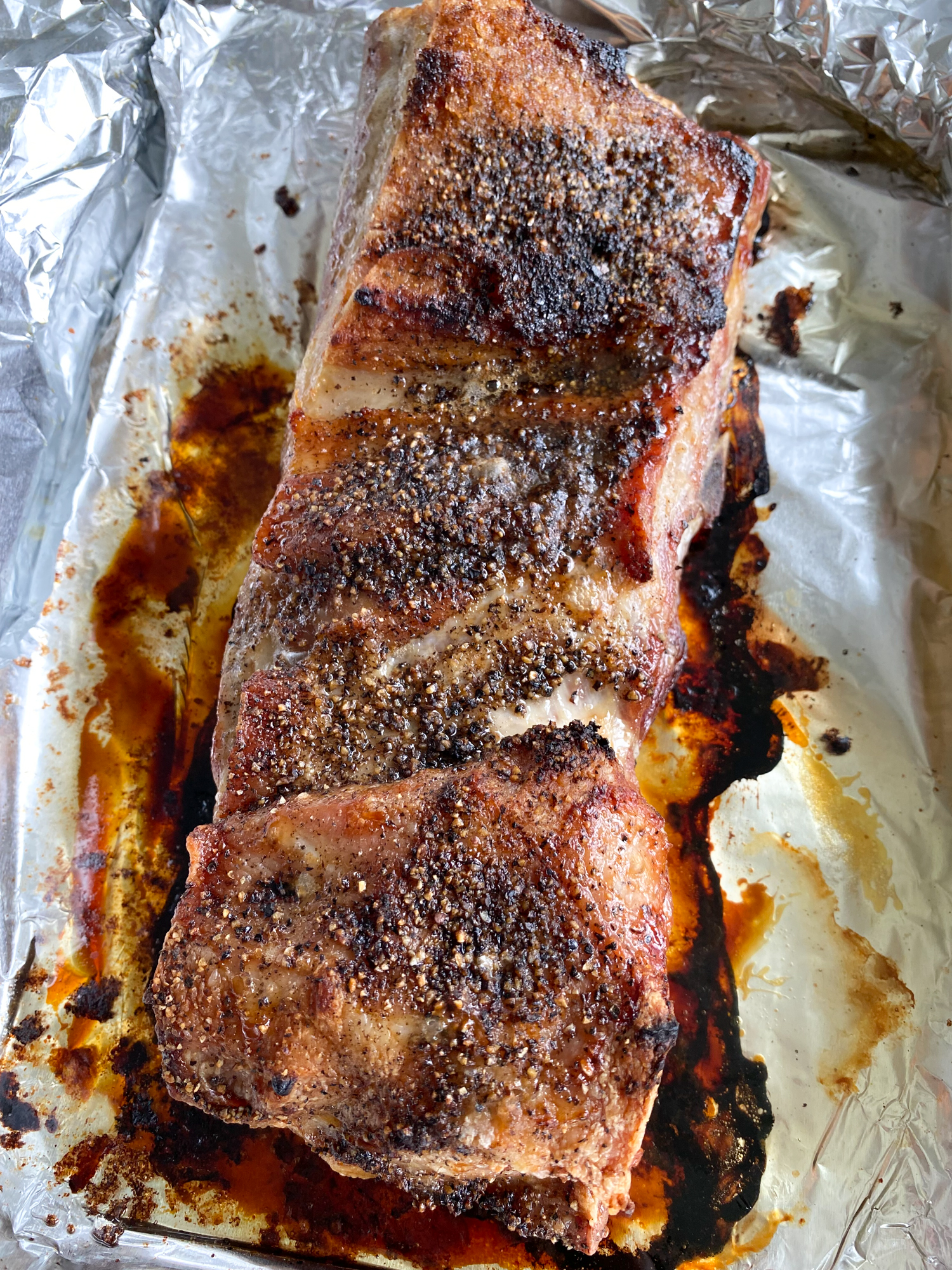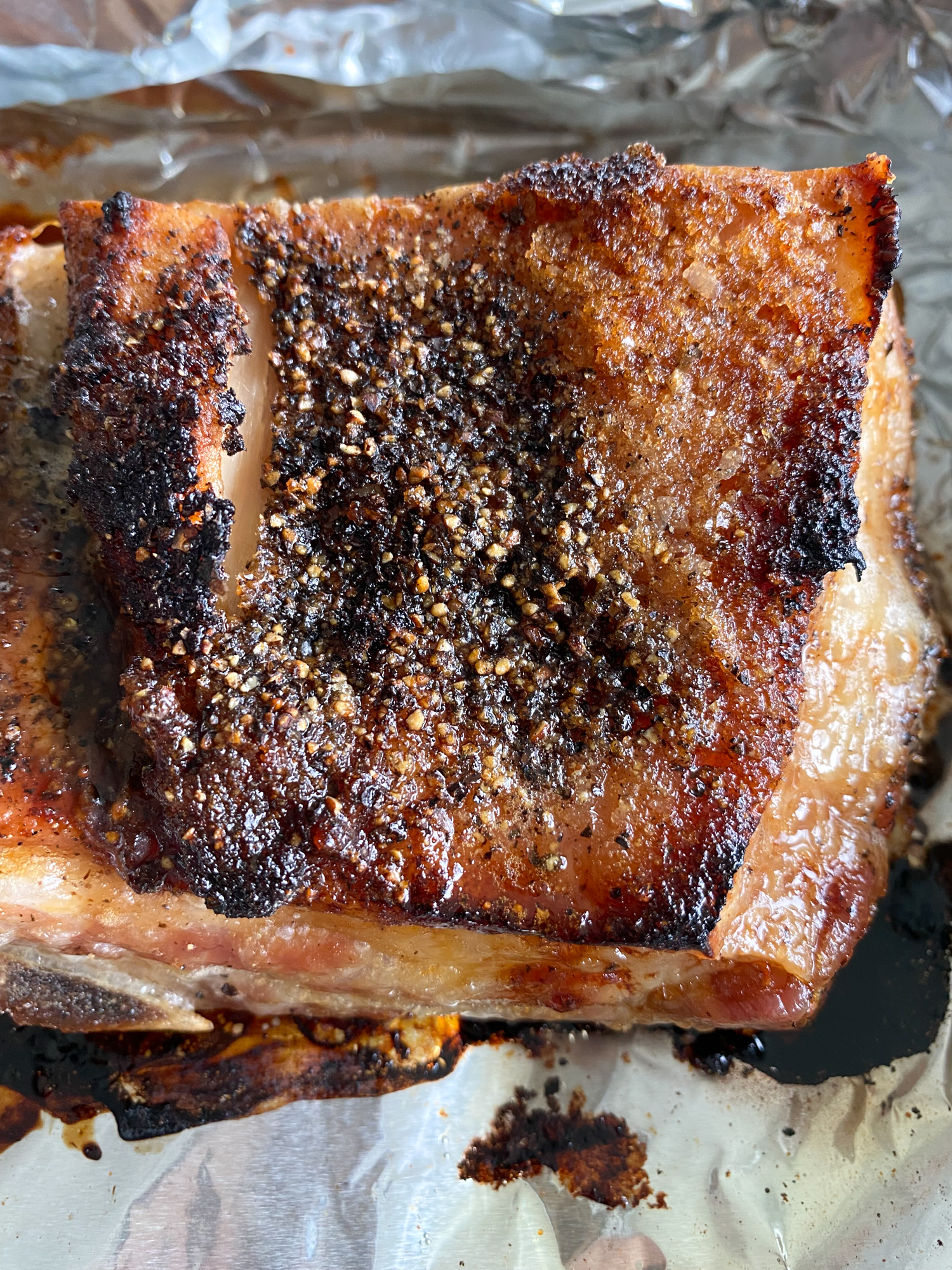 The next recipe, which I adapted, says it’s from the Momofuku Cookbook by David Chang. It says to heat the oven to 450F, fat side up, and cook for 1 hour, basting it with the rendered fat at the halfway point, until it’s an appetizing golden brown. And then you turn the oven temperature down to 250F and cook for another 1 hour to 1 hour 15 minutes, until the belly is tender.