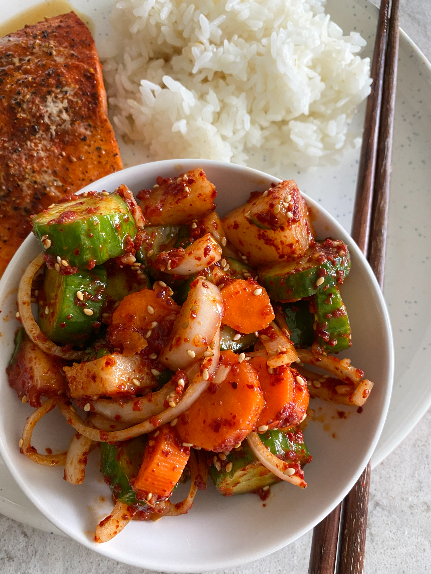 - Into the same bowl, add in the carrots, onions, Korean pear (if using), gochugaru, garlic, ginger, sugar, vinegar, sesame oil, fish sauce and the green onions. Mix together until everything is combined and all of the vegetables are nicely coated. Taste and adjust anything as needed (to your taste). To serve: garnish with the sesame seeds and enjoy!