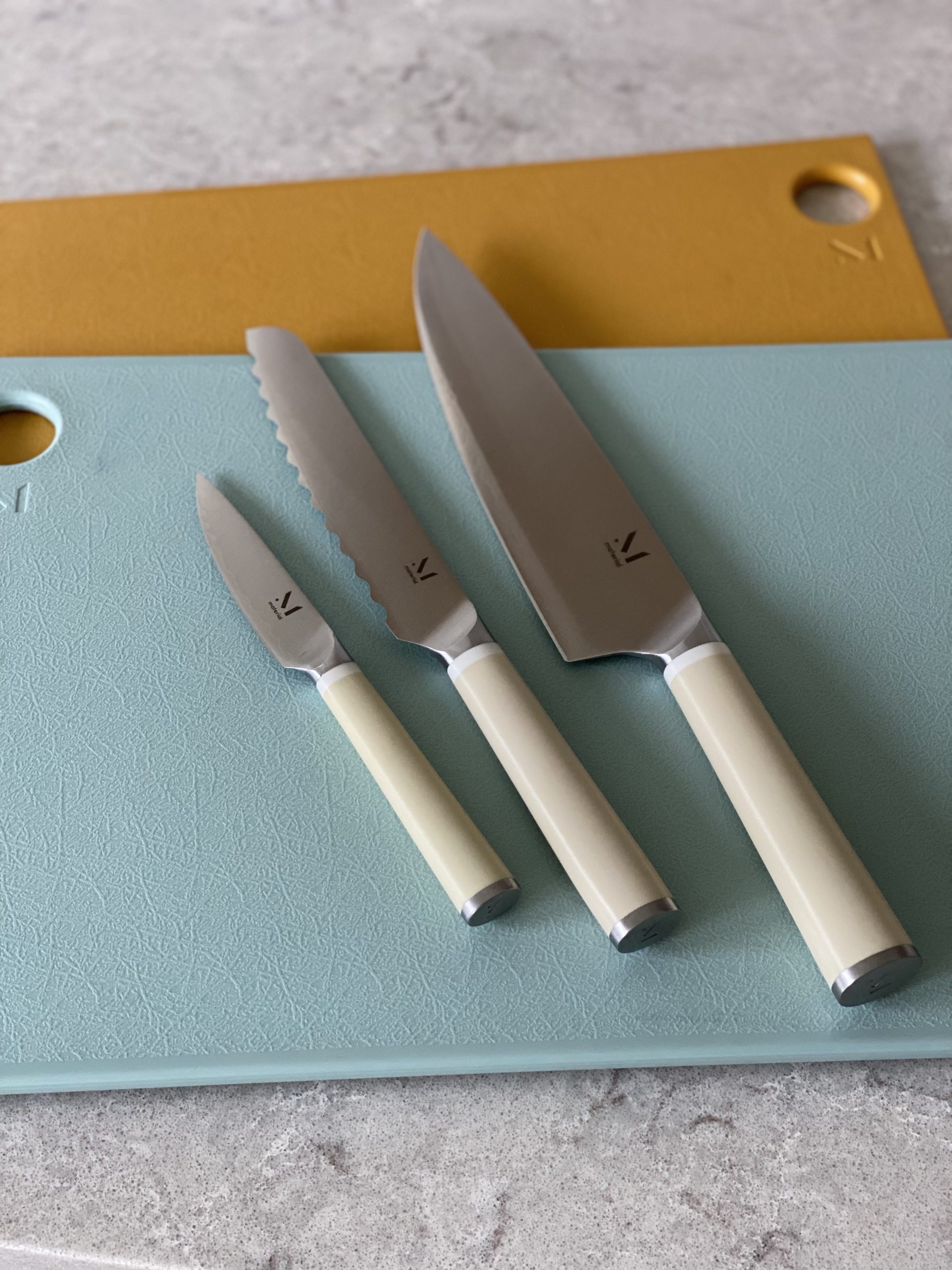 Three knives are all you need: one big, one small, one serrated. Make chopping a breeze with these ultra-sharp, perfectly-balanced, and low-maintenance knives. The handles come in three different colors: this is Cool Neutral, they also come in: Blue Grey and Almost Black.