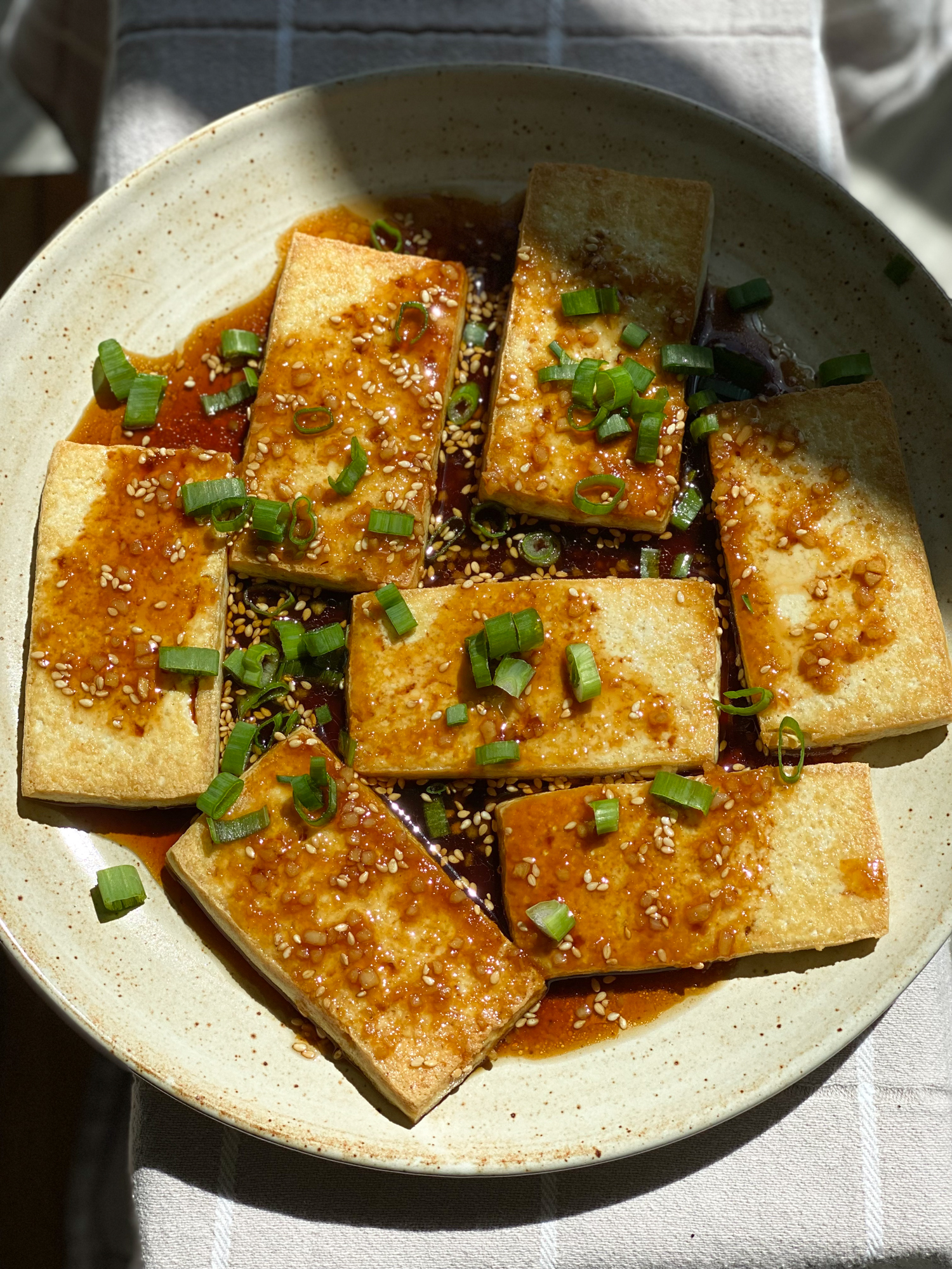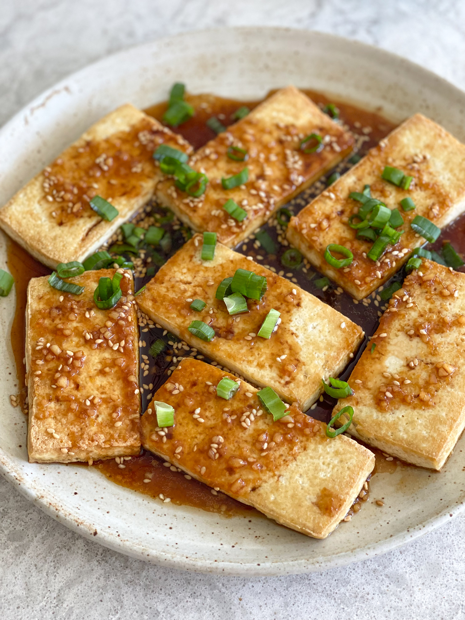 - Using a large pan or skillet, over medium high heat, heat the oil until shimmering or for a few minutes. Add the tofu and cook turning once, until browned and crispy, for about 7 to 8 minutes per side. Drain on paper towels. To serve: place the pan fried tofu on your serving plate and spoon the sauce over the fried tofu. Garnish with scallions and toasted sesame seeds if desired. Serve with white or brown rice and enjoy!