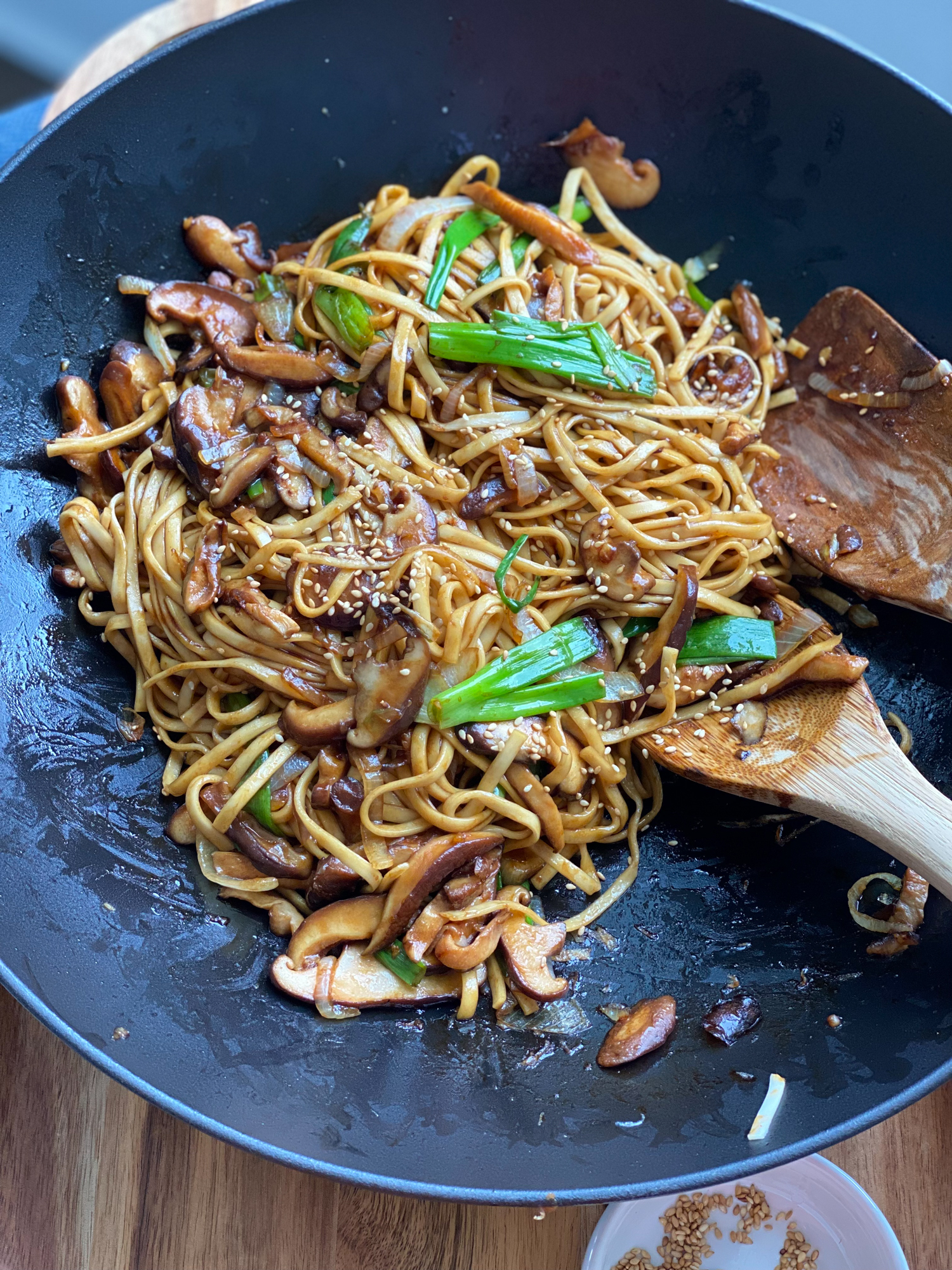 - Using a wok or large pan over medium high heat, add 1 tablespoon vegetable oil, and after a minute or two, add the onions. Cook until softened and then add the garlic and toss together. Add the shiitake mushrooms and cook until softened. Add the chives or green onions, and toss together again and cook for a few more minutes.