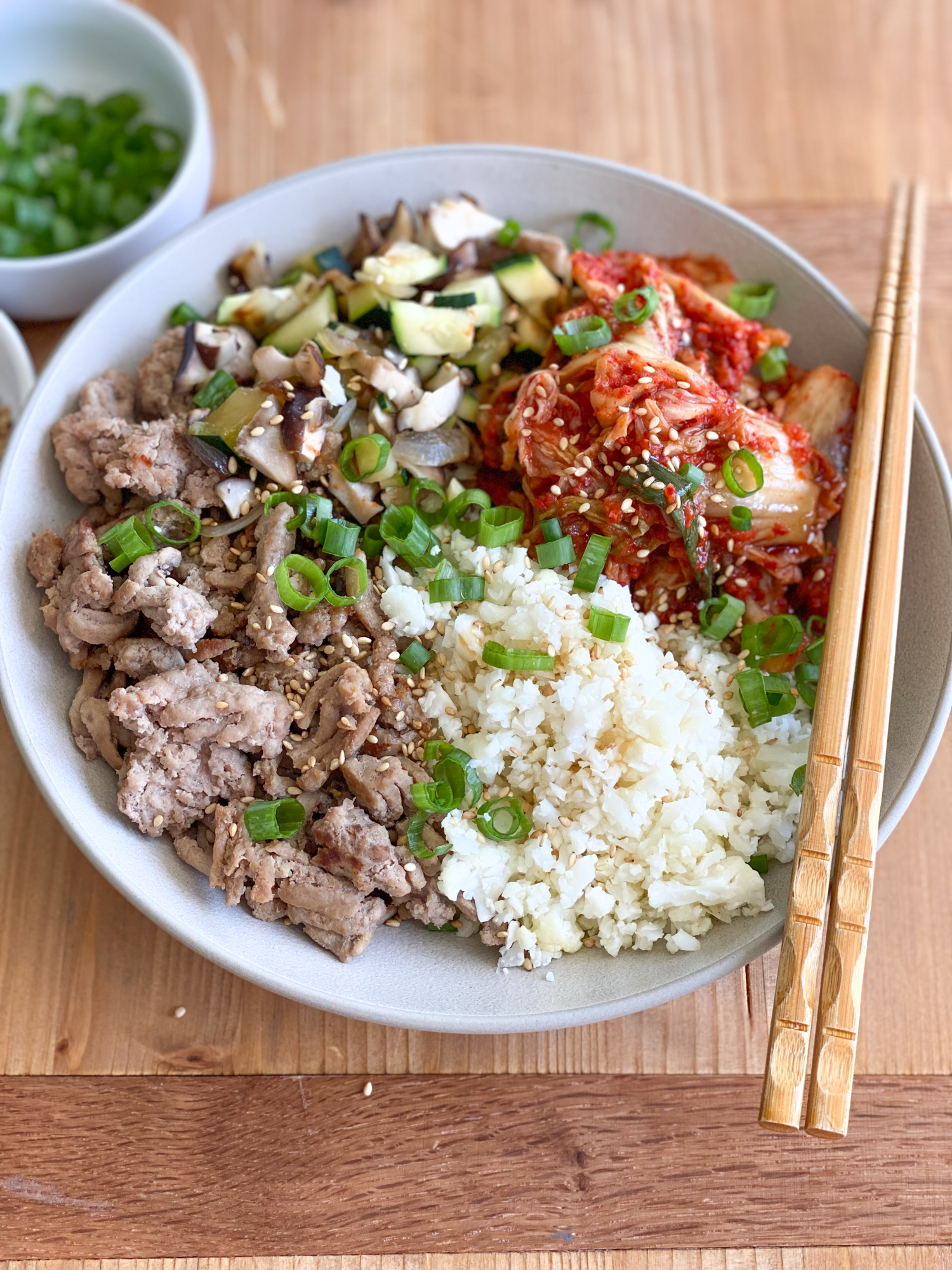 - To serve: Place some cauliflower rice on the bottom of your serving dish. Top with the cooked vegetables and cooked seasoned Jennie-O Ground Turkey. Add a light drizzle of sesame oil if desired. Add some kimchi and garnish with the scallions and toasted sesame seeds. You can crush the gim and sprinkle over the top, or you can eat everything with the gim, placing a little bit of everything onto a piece of gim, wrapping and eating. Enjoy!