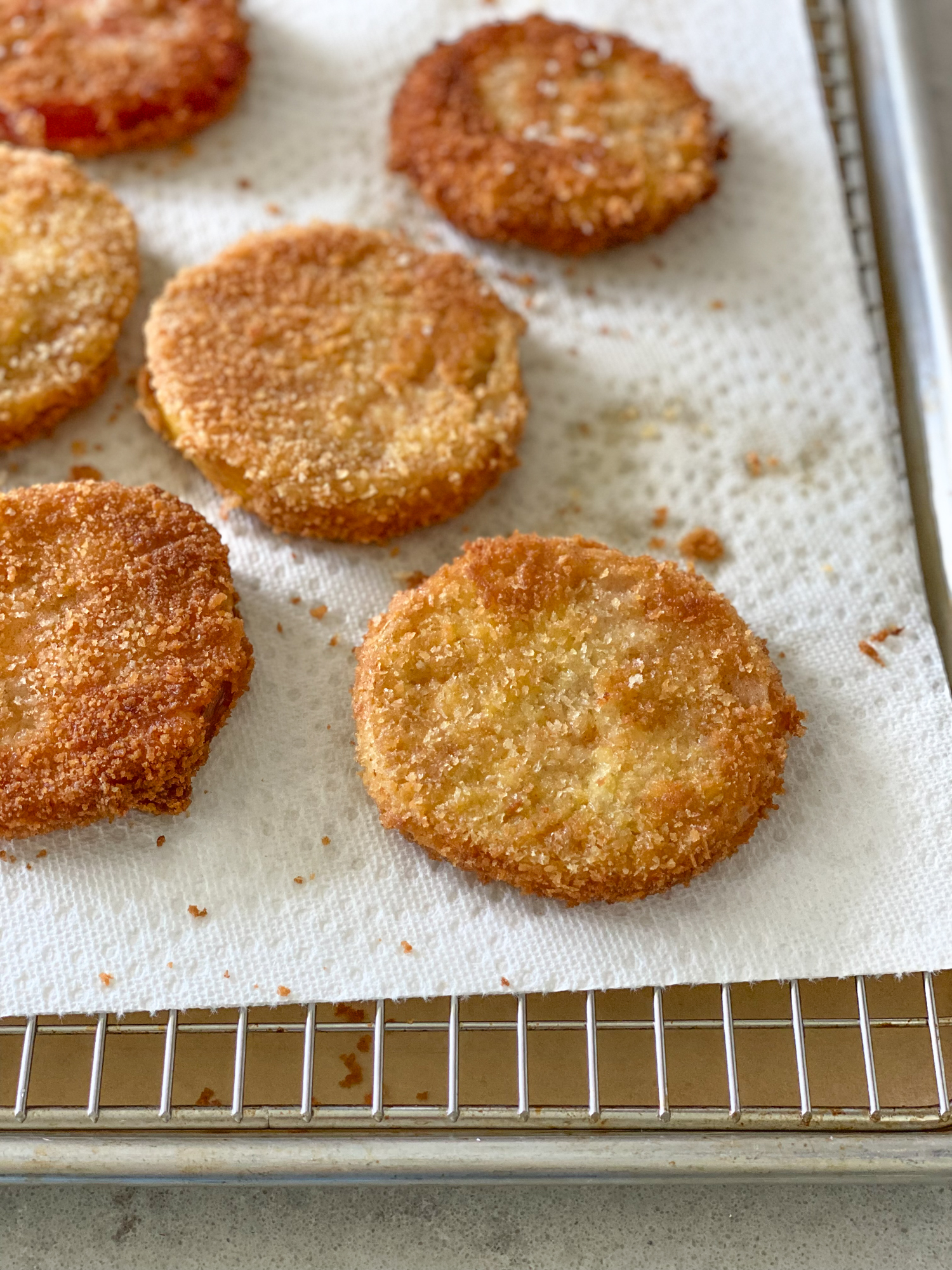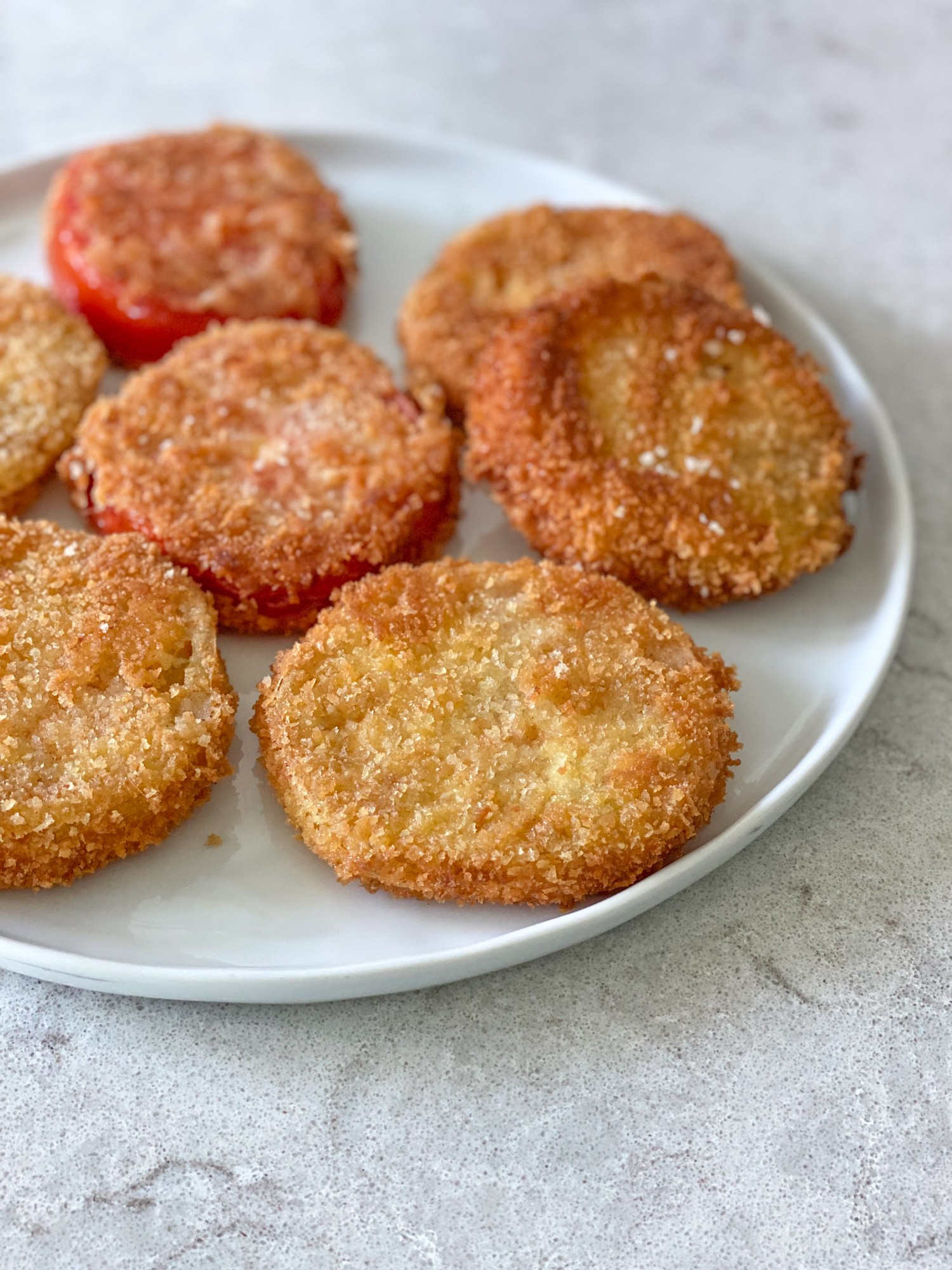 I was recently inspired by Erica from TikTok to make Fried Green Tomatoes! and for the record my tomatoes were green when I purchased them. . and started changing colors as I left them on my counter for about 3 to 4 days. I had some leftover panko so I fried a firm red beefsteak tomato as well.