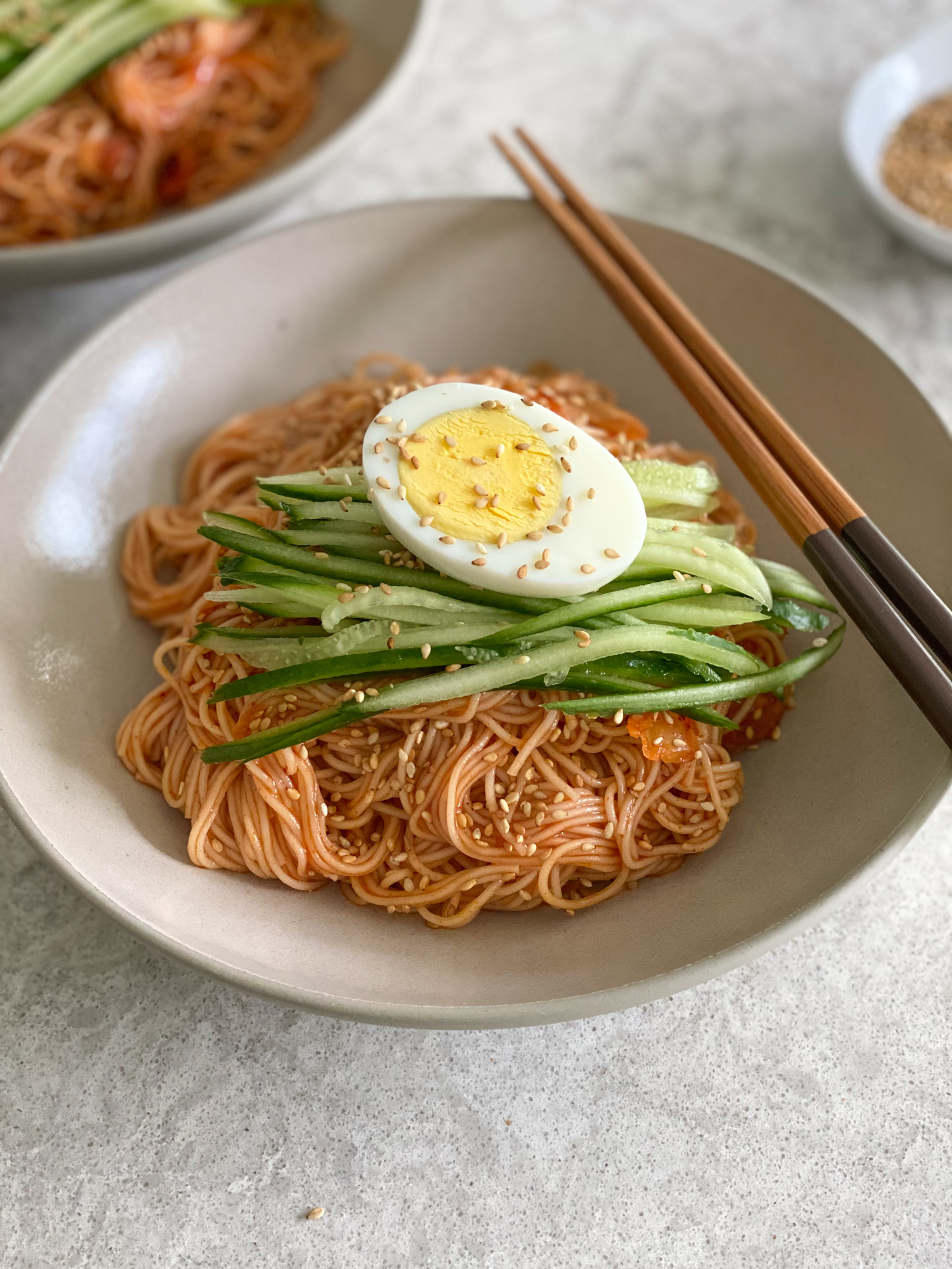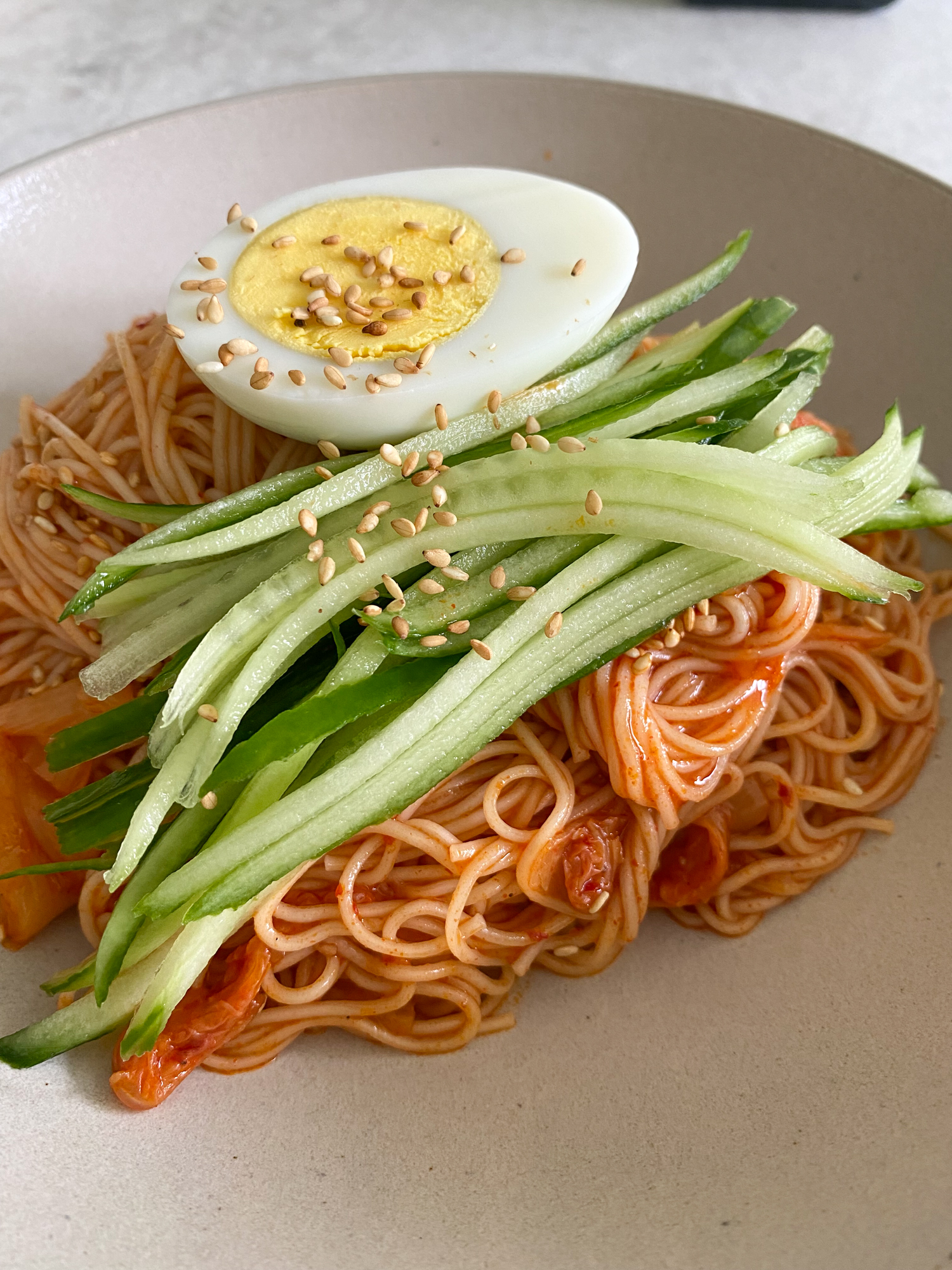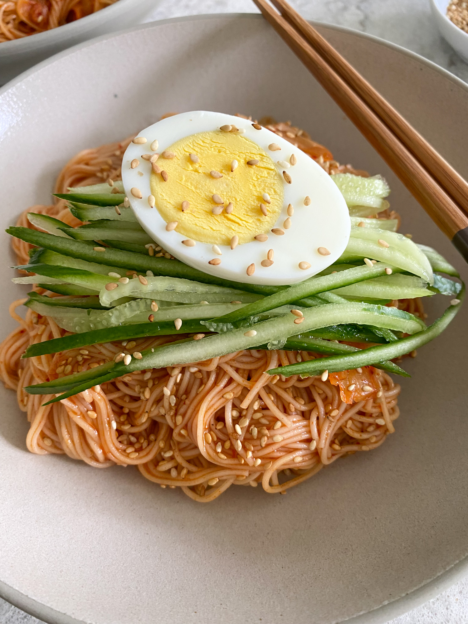 These noodles may not look very spicy but believe me, they are packed with heat, a little sweetness and a little acidity. This Bibim Guksu, for me, is perfectly balanced and so delicious! The sauce mixture is made up of Korean gochujang, kimchi, sugar, rice vinegar, sesame oil, soy sauce and garlic. You can control the sweetness level by how much sugar you add. You can also control the heat level by how much gochujang and kimchi you add. You can also add some fine gochugaru powder or flakes for added heat.