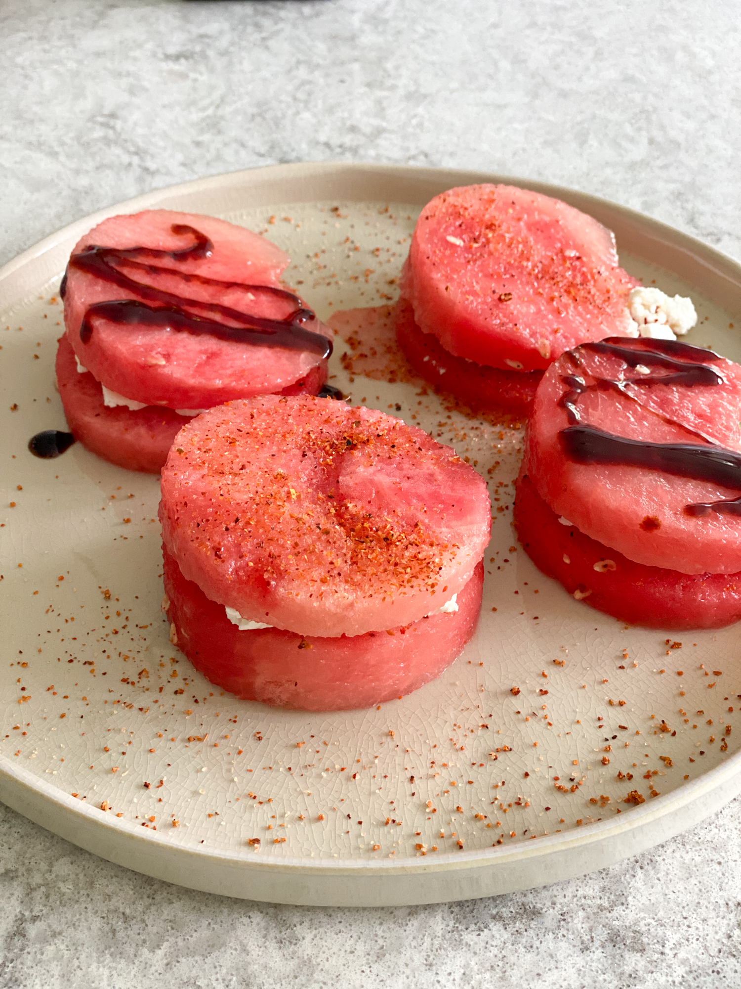 - Add the feta cheese slice on top of half of your watermelon rounds. If your feta crumbles, that's fine. Just top each watermelon piece with feta. Top with the another watermelon round to make a sandwich. Sprinkle more Tajín and/or some balsamic glaze. Garnish with fresh mint or basil if wanting to add something green. Keep cold, serve and enjoy!