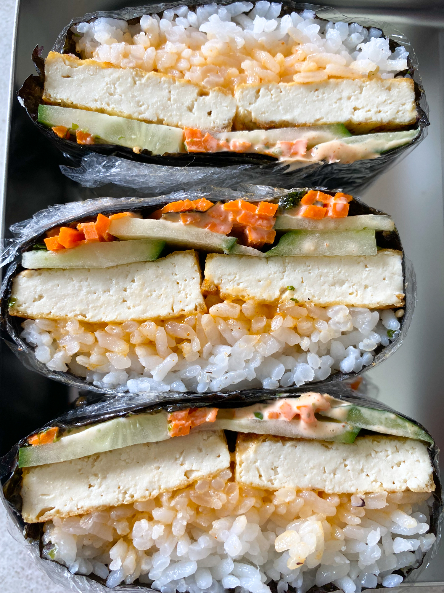 Tofu Veggie Onigirazu made with pan fried tofu, thin sliced cucumber, shredded carrots and spicy mayo. So easy to make and delicious!