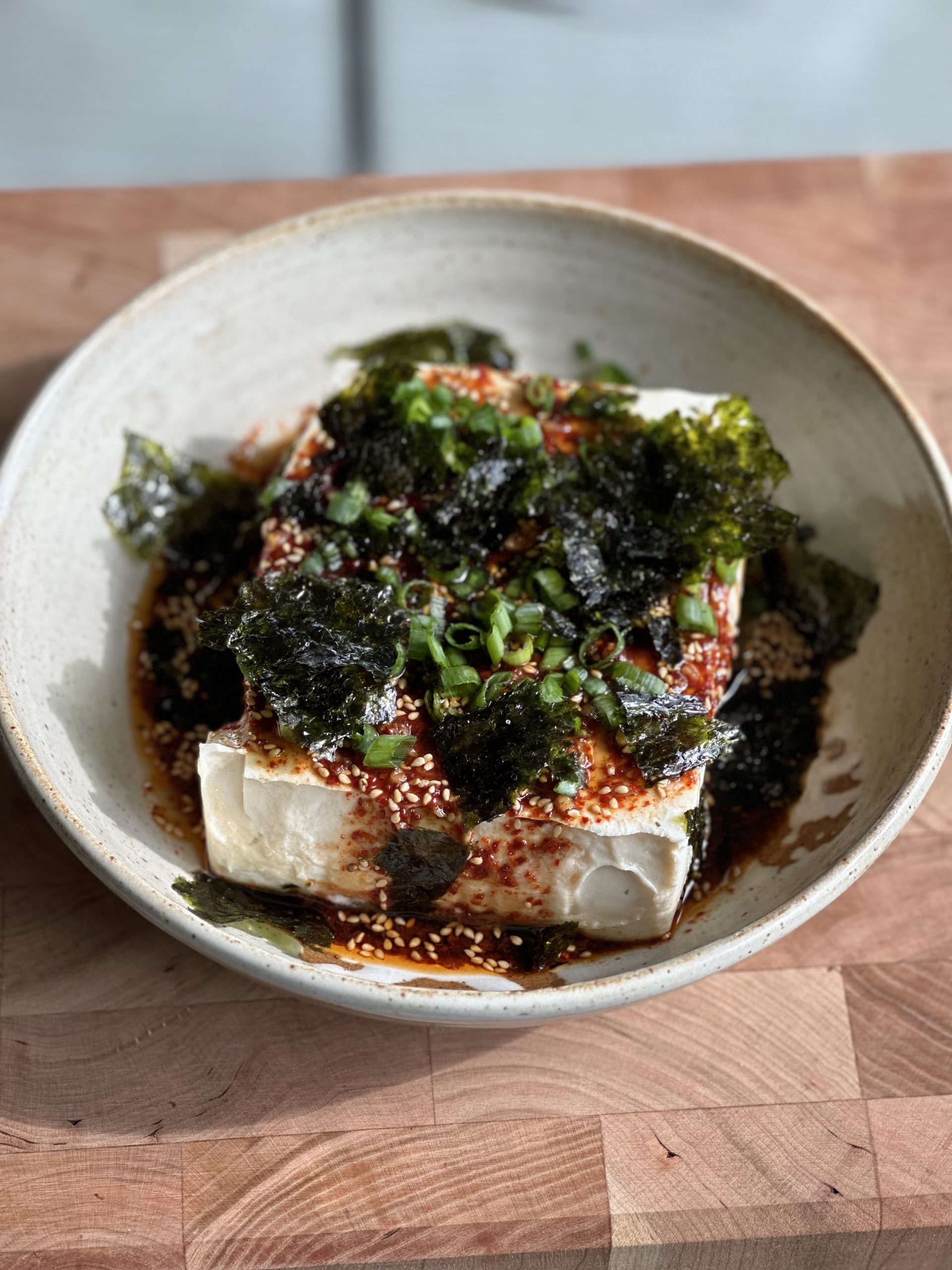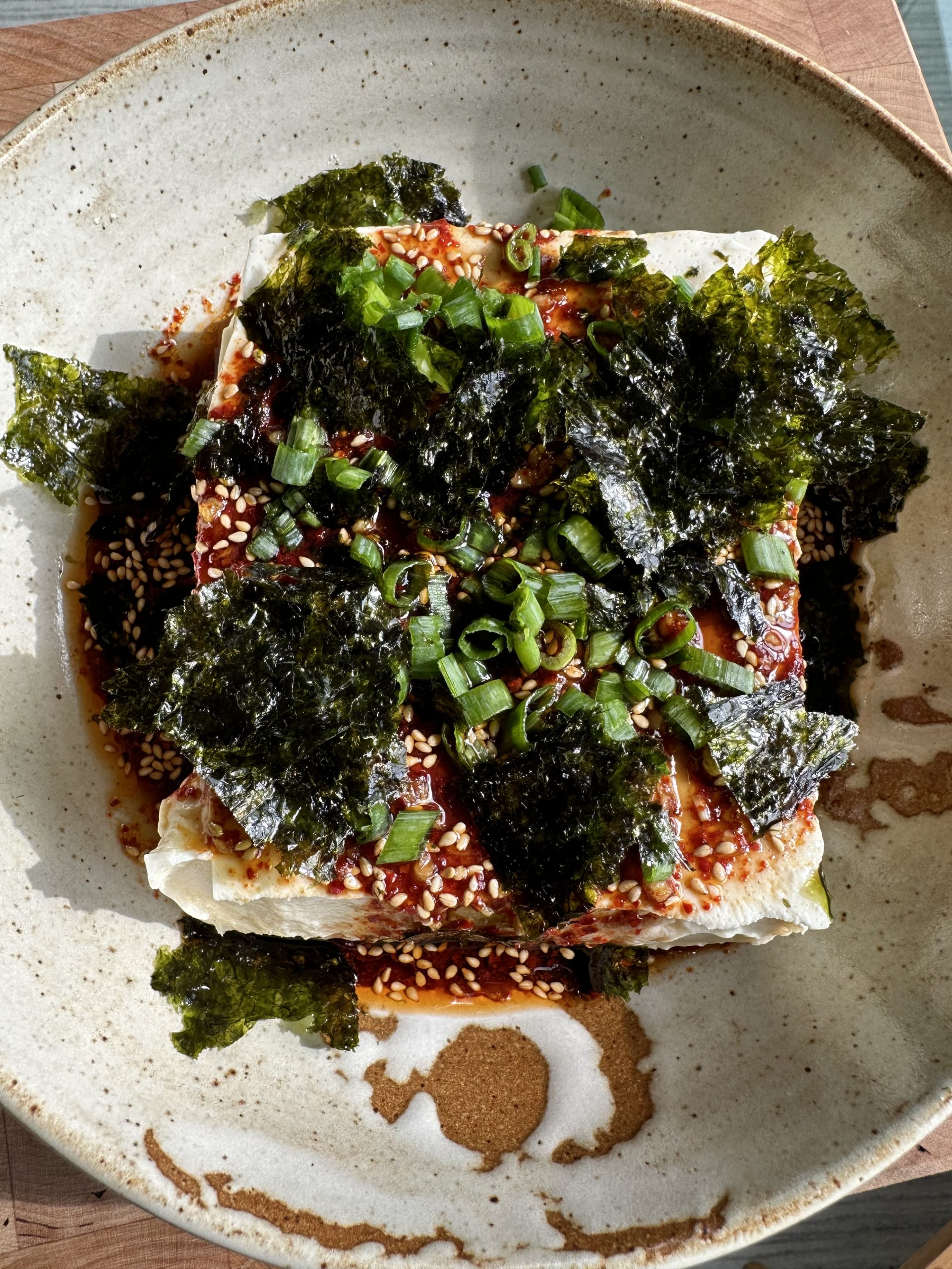 - In a small bowl, combine all of the ingredients from the soy sauce to the sesame seeds. Taste and adjust anything as desired. Pour over the tofu and add the crushed gim over the top. Serve with hot rice and enjoy!
