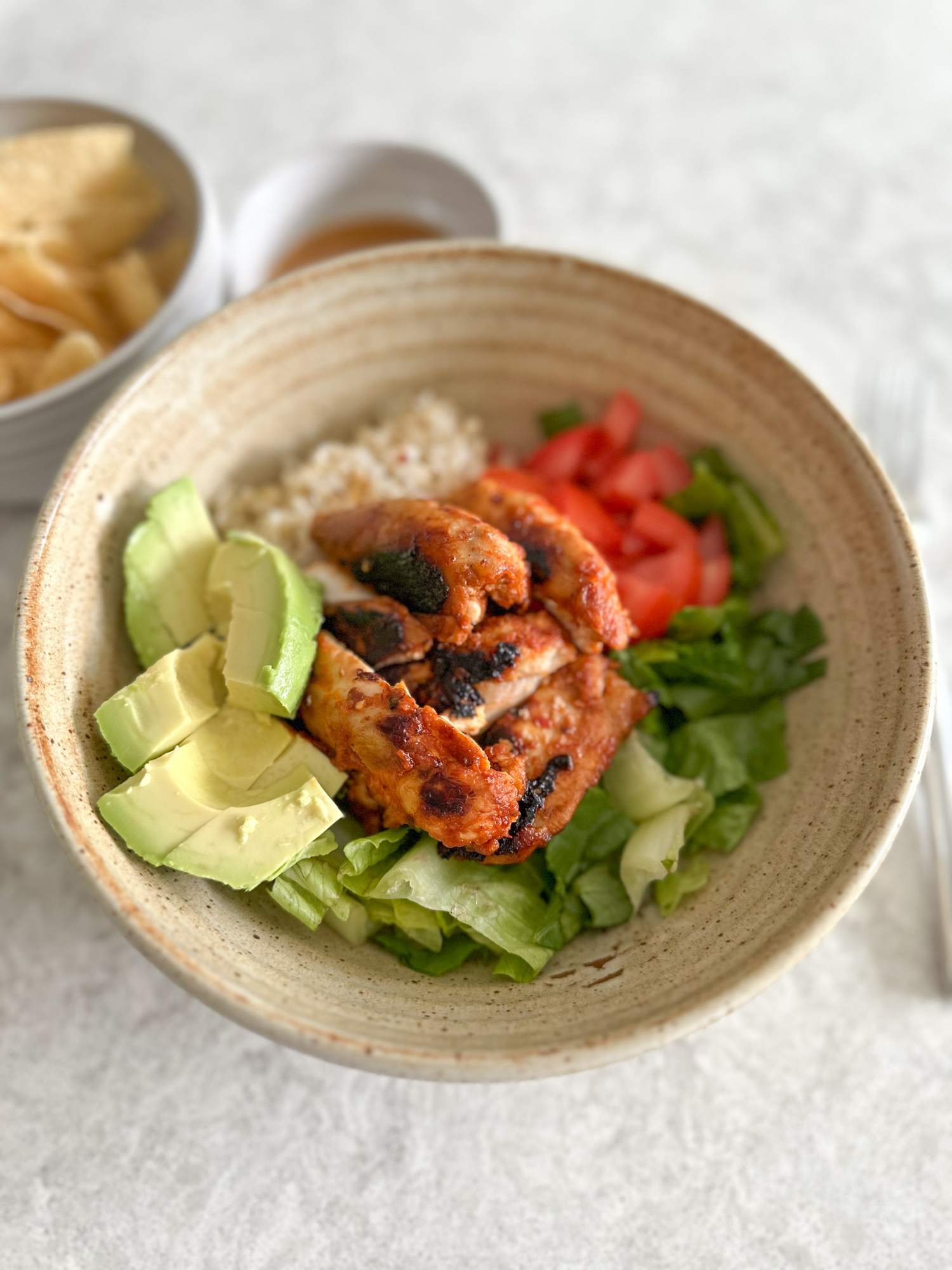 - Assemble your bowl with the rice on the bottom. Add the cooked chicken and all the other toppings. Drizzle the Chipotle Honey Vinaigrette over the top and enjoy! Serve with tortilla chips and lime wedges if preferred.