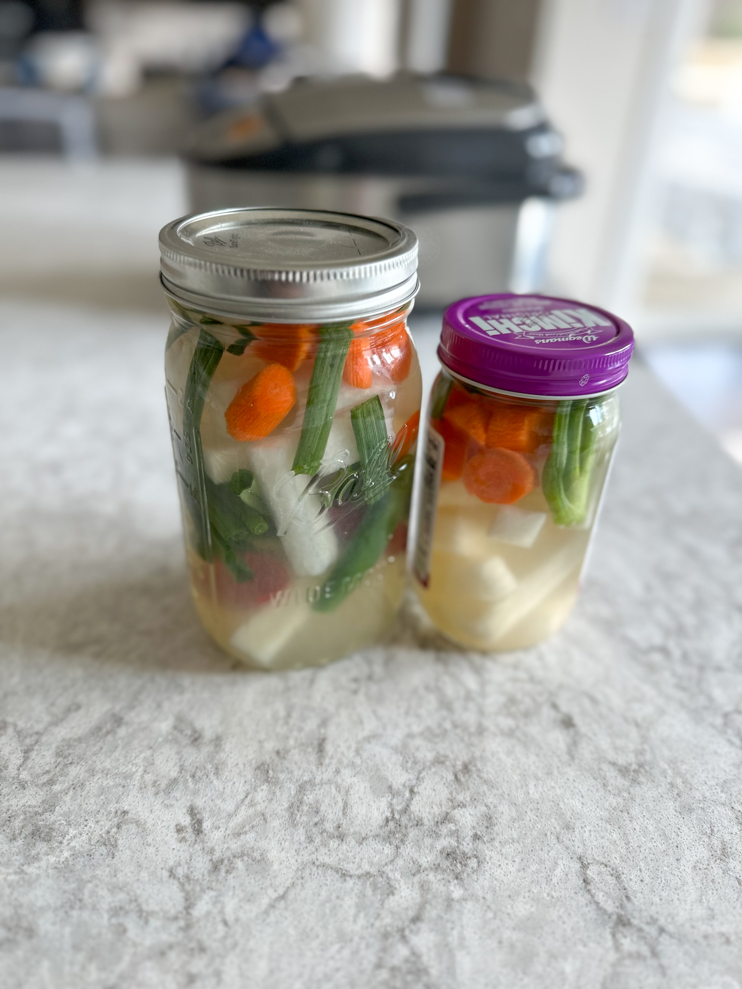 - After 30 minutes, rinse the radish under cold running water a few times to remove any salt and sugar. Place the radishes, along with the green onions and chili peppers into a jar or container. Pour the brine over the top and seal closed.