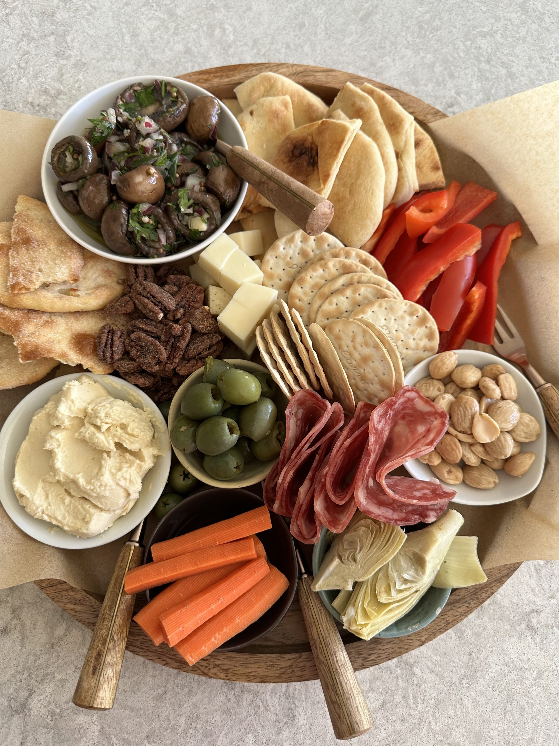 I love a good snack board! I think I love the simplicity and the variety. Anytime I can eat and enjoy bites of all of my favorite foods, I’m in! Marinated and pickled anything, I am a huge fan of. The recipe for the marinated mushrooms is below and click here for my quick pickle recipe, which I use to quick pickle a lot of vegetables, including the carrots above.