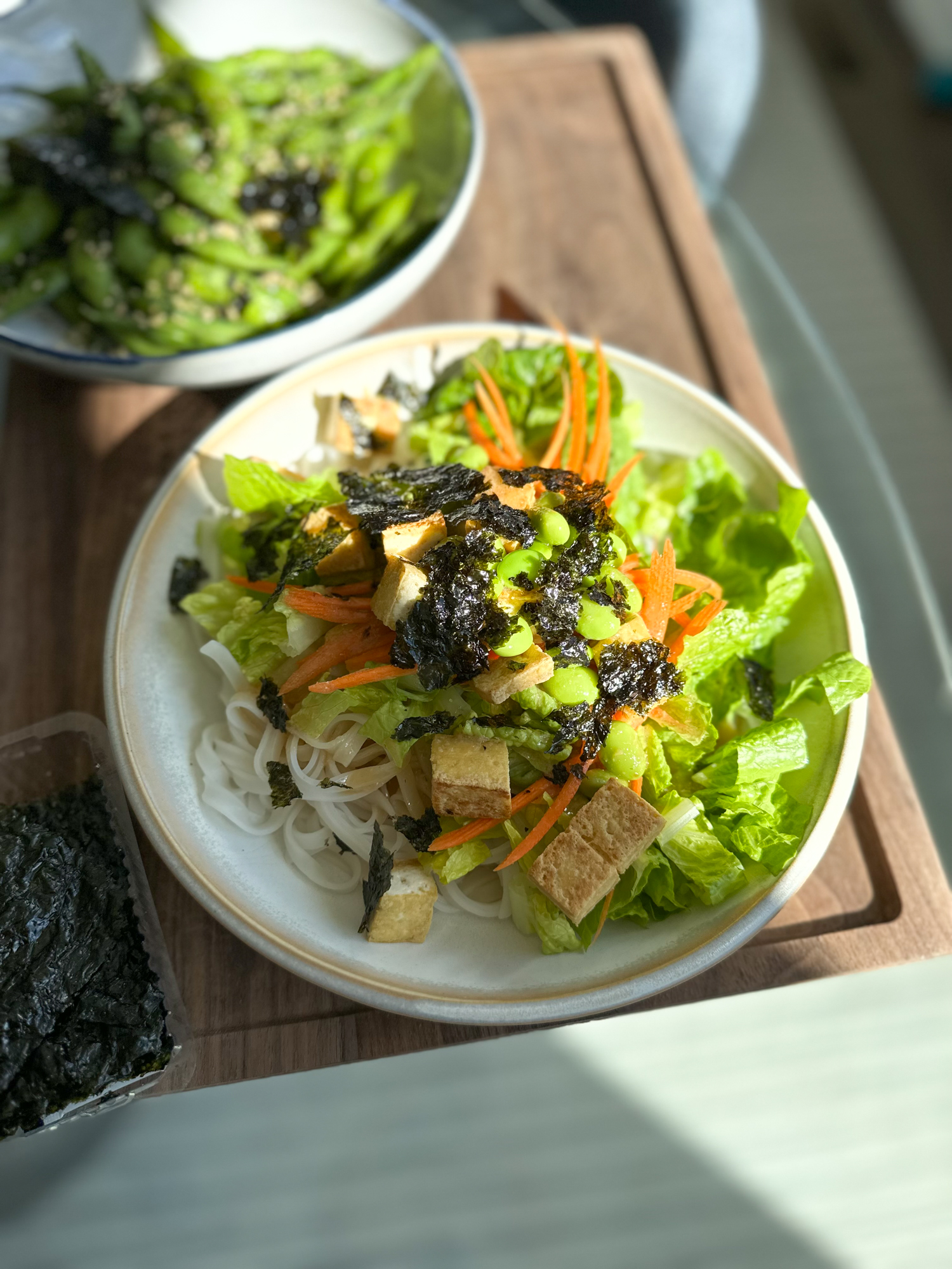 - After prepping and making the pan fried tofu and noodles, assemble your salad bowls: place noodles into a bowl, arrange lettuce, carrots, other veggies if using, pan fried tofu and edamame on top. Drizzle with the dressing and garnish with crushed nori. Mix together and enjoy!