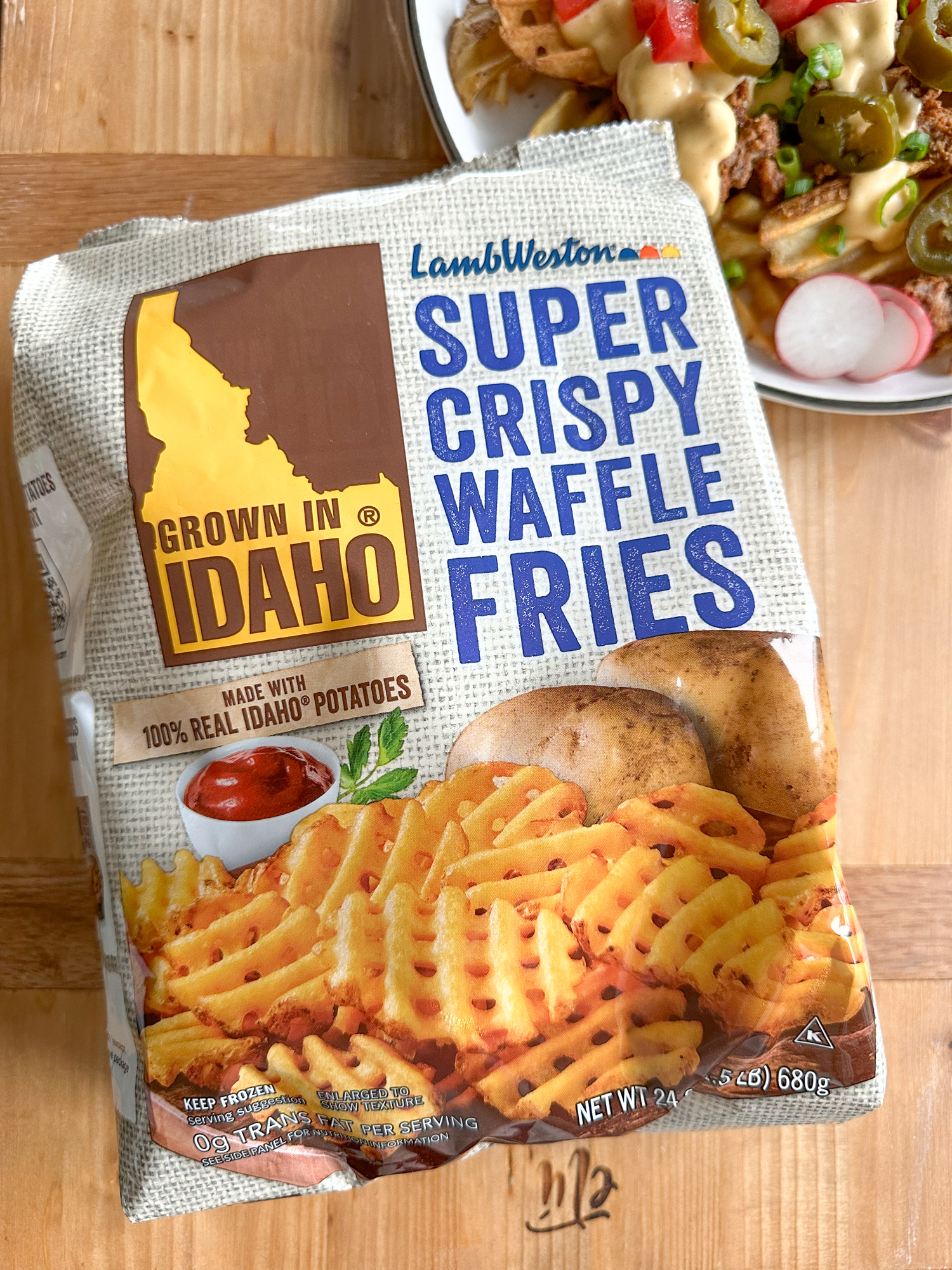 Crispy Waffle Nacho Fries using Grown In Idaho™ Super Crispy Waffle Fries!! Super crispy and delicious and so easy to make in the air fryer or in the oven. They are made from 100% real Idaho® Potatoes! Once you try these, you won’t want to buy anything else!