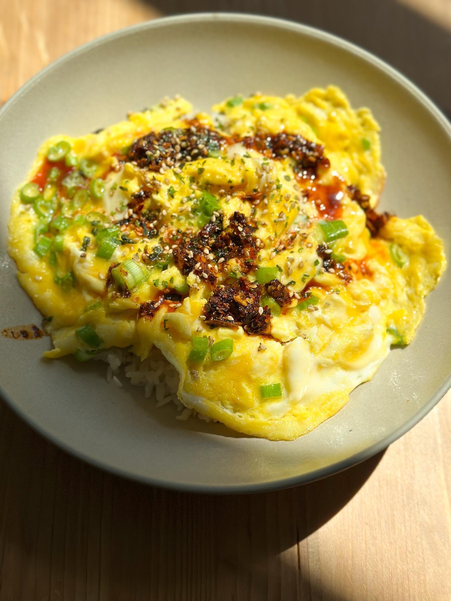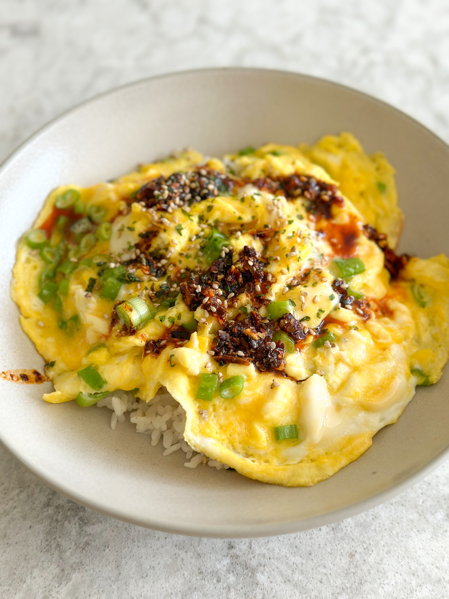- To plate: add your cooked rice to a shallow bowl, add a light drizzle of sesame oil. Top with the cooked soft scrambled eggs. Add chili oil and some furikake and enjoy!