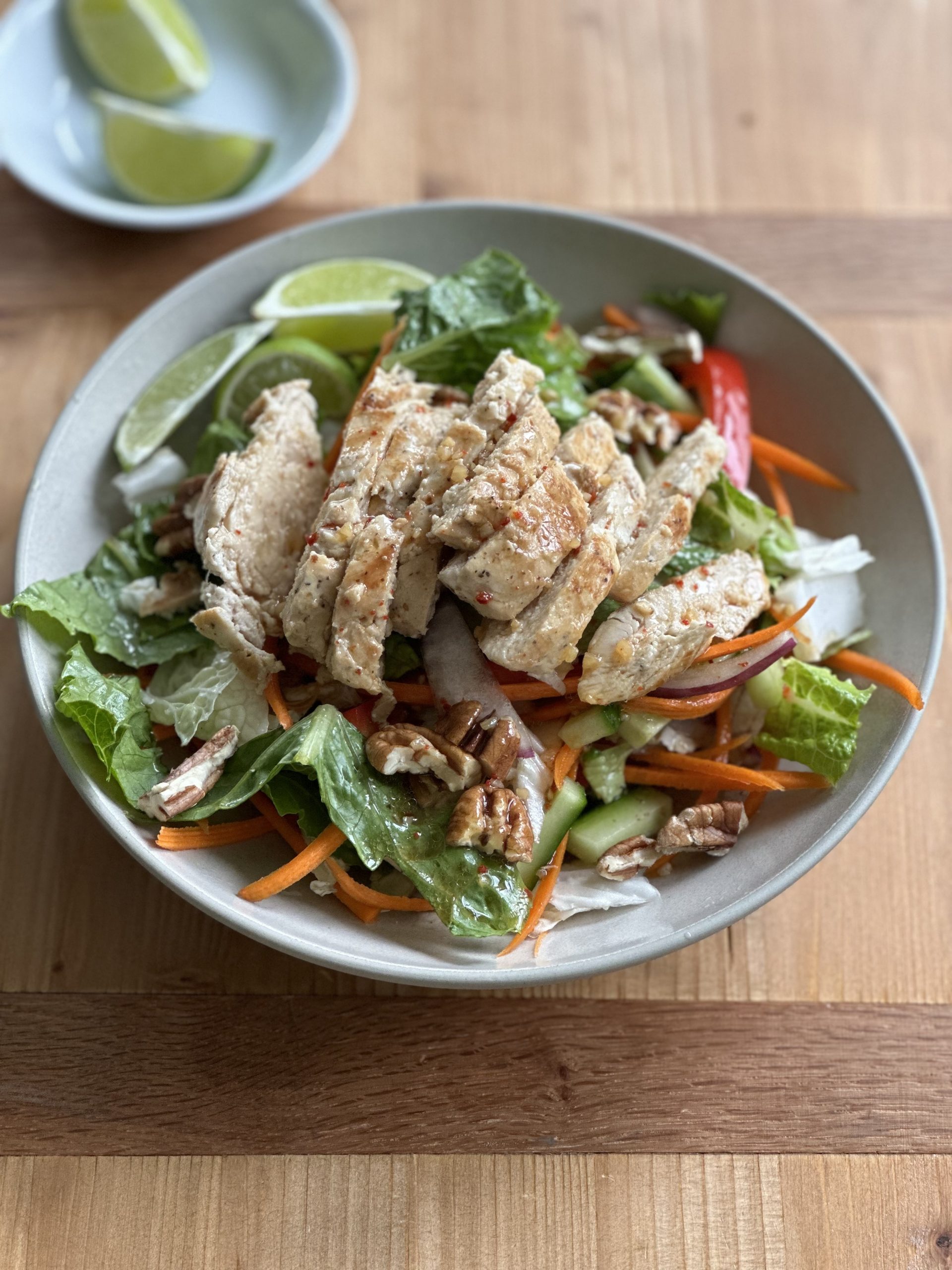 I’m using chicken but you can use any protein you like: beef, tofu, pork, salmon etc. I don’t think I’ve ever eaten as much protein as I do now. I probably eat 1 to 2 chicken breasts a day in addition to eggs and other stuff. Chicken, tuna and salmon and my go-to proteins for salads. I love marinating and meal prepping chicken breasts so I always have some cooked chicken in my fridge. Click here for my go-to chicken marinade recipes.