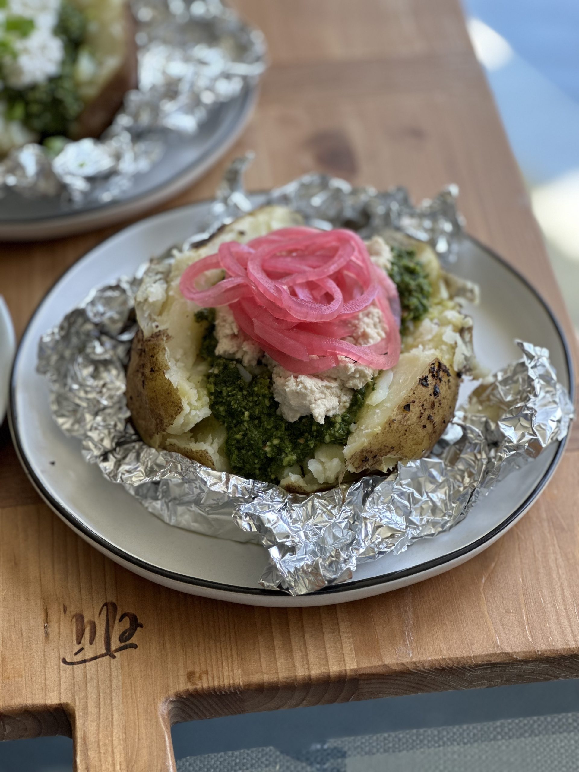 - Once your baked potatoes are fully baked and ready, allow them to cool for a few minutes. Slice open with a knife and stuff: add the pesto and tuna and top with the pickled red onions if using. For the next potato, slice open with a knife and stuff: add the pesto and cottage cheese and garnish with green onions or chives. Enjoy!