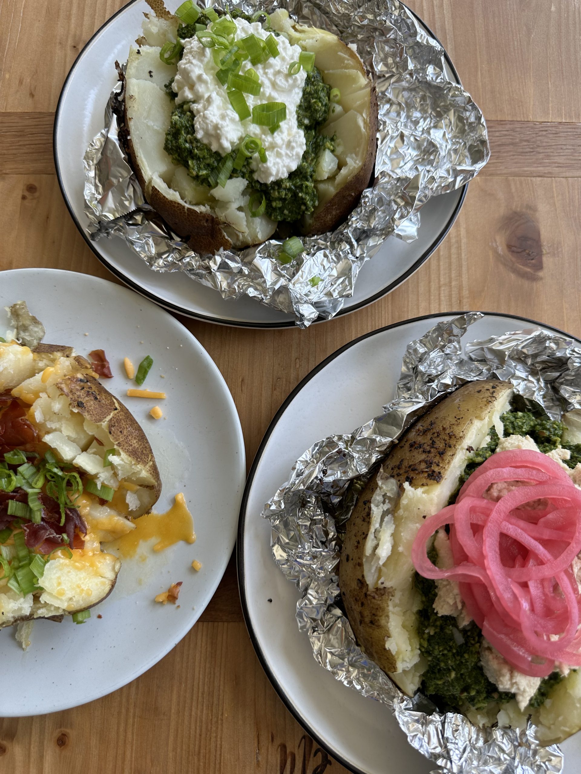 The beauty of baked potatoes is that they are so easy to make and you can make them in advance! Bake them the night before and refrigerate overnight. When you are ready to eat them, simply warm them up and then put on all of your toppings and you are good to go!