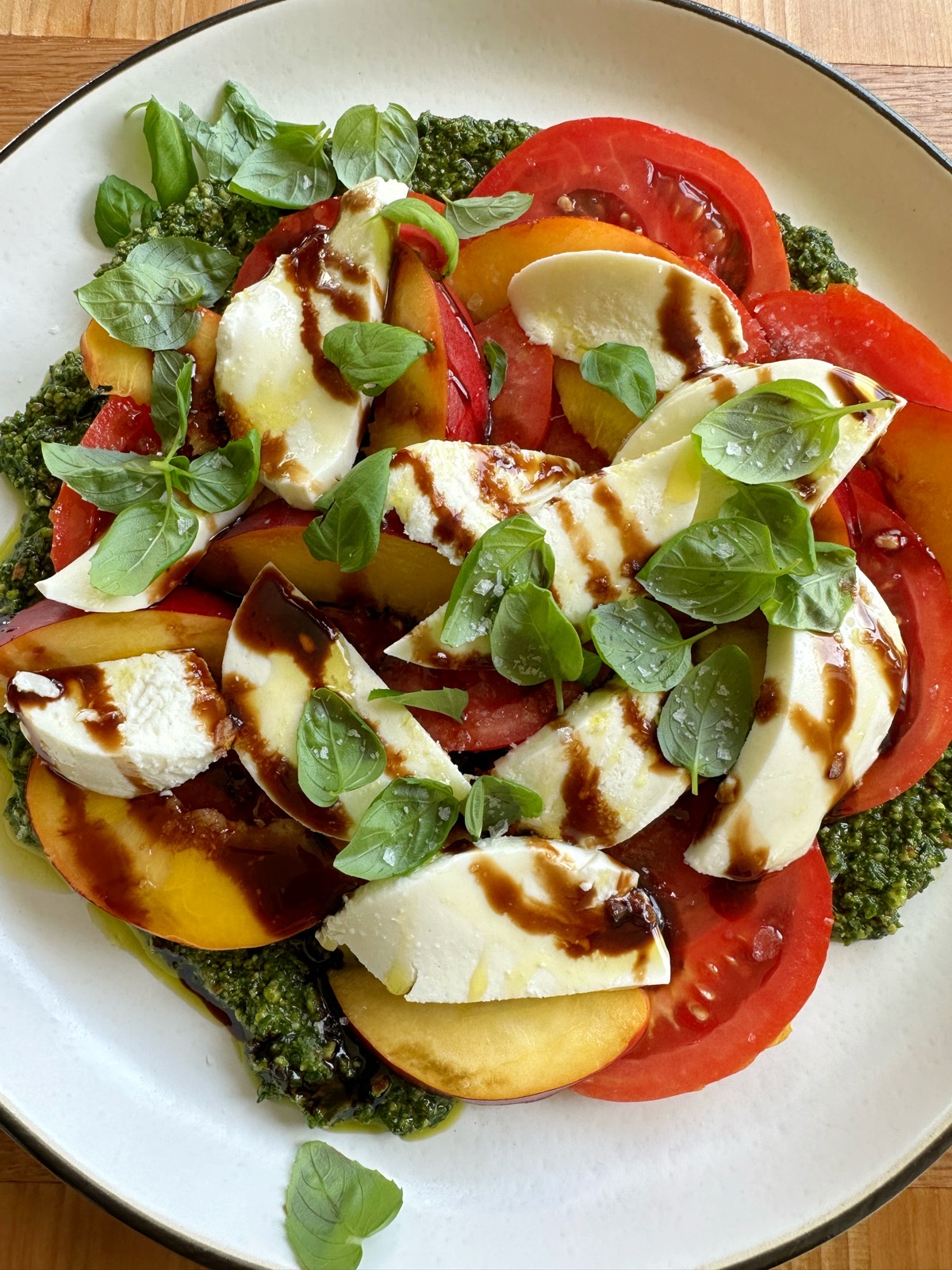 - Using a large plate or platter, place some pesto on and spread across the plate. Arrange the tomatoes, nectarines and mozzarella pieces over the pesto and around the plate. Drizzle some olive oil and balsamic glaze over the top. Garnish with fresh basil and sprinkle Maldon sea salt flakes over the top. Serve and enjoy!
